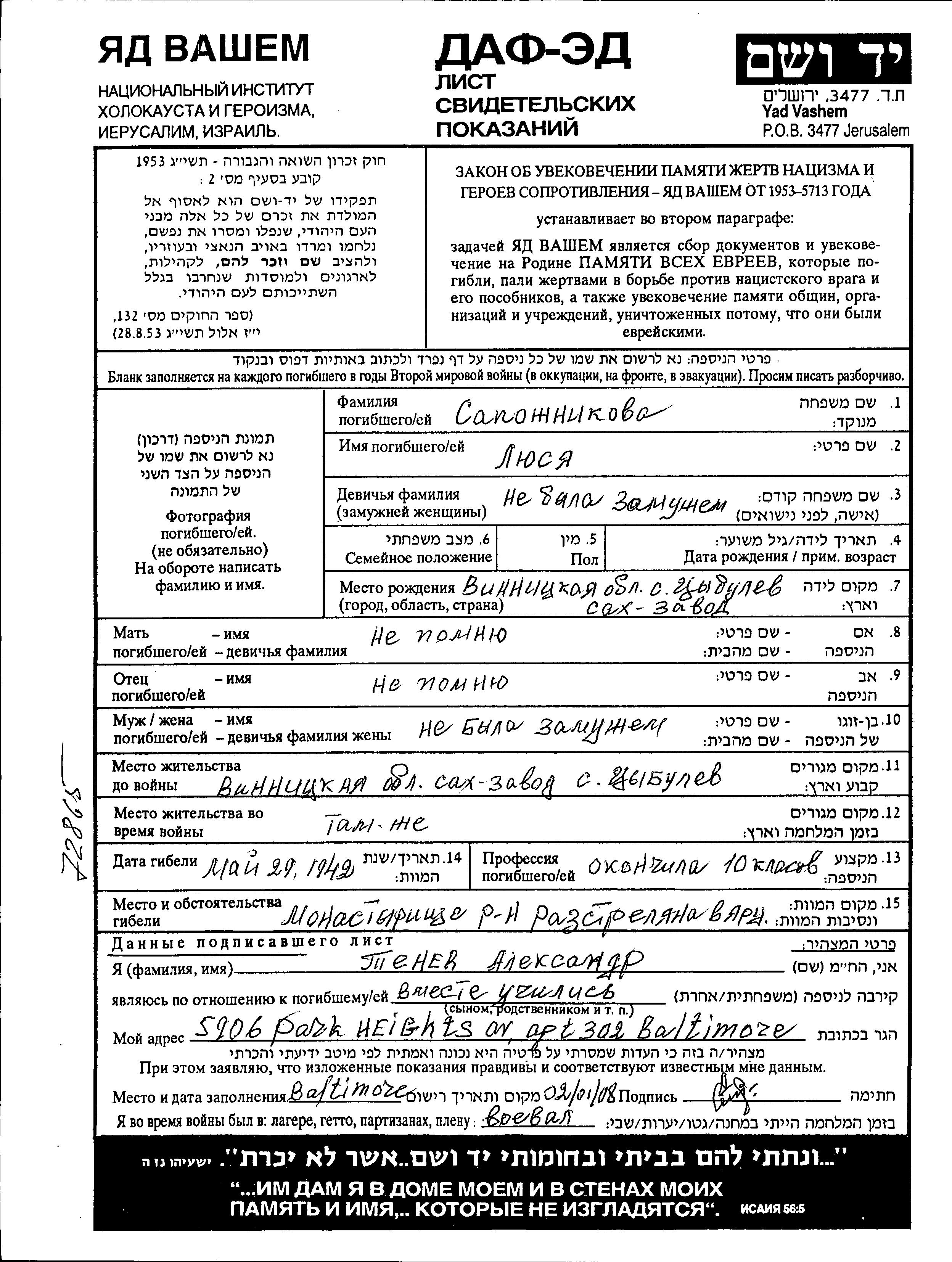 Lyusya Sapozhnikova was born in Tsybulev, Ukraine (USSR). Prior to WWII she lived in Tsybulev, Ukraine (USSR). During the war she was in Tsybulev, Ukraine (USSR). Lyusya was murdered in the Shoah. Place of death: Monastyrishche, Ukraine (USSR), 29/05/1942.