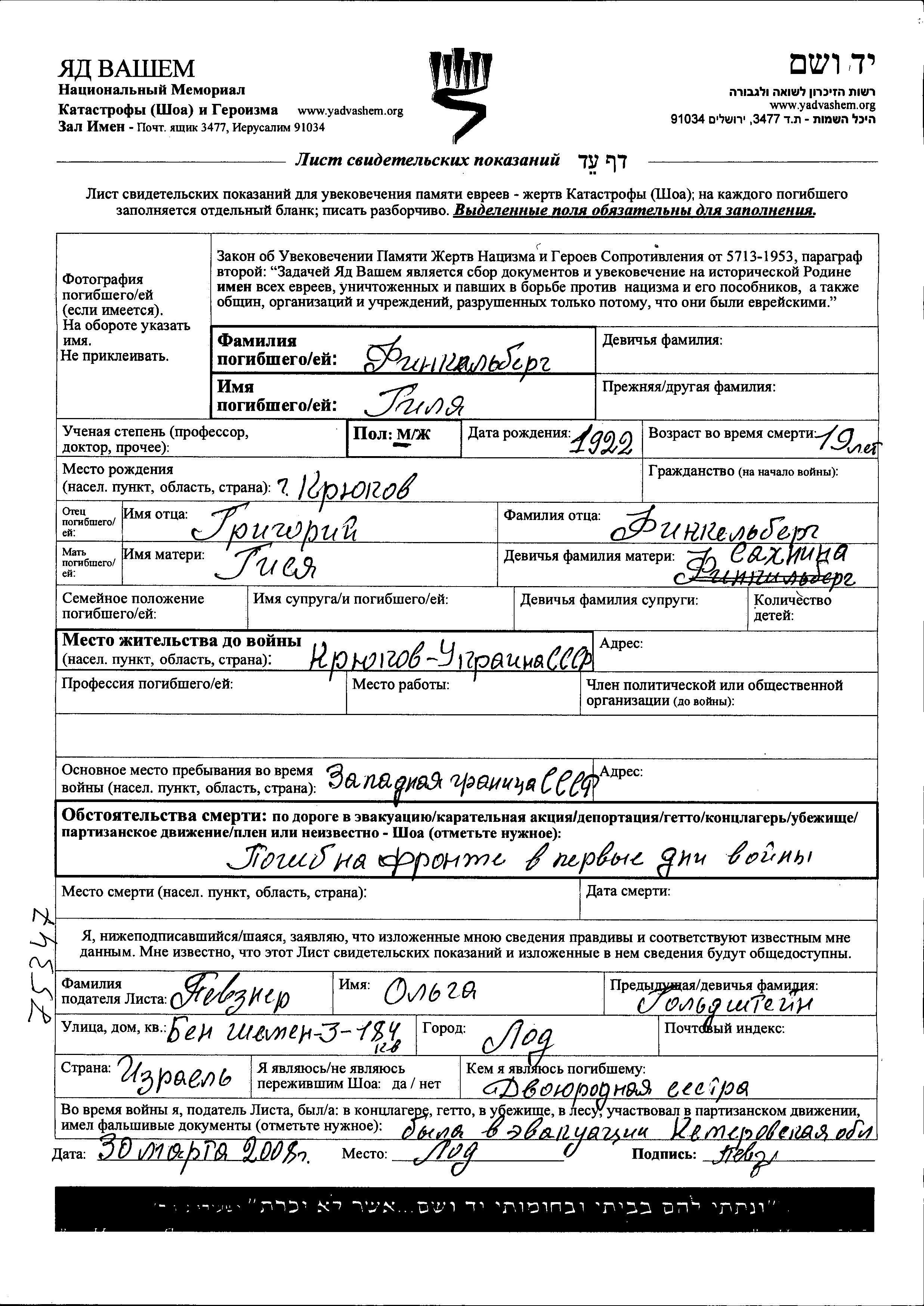 Gilya Finkelberg was born in Kryukov, Ukraine (USSR), 1922 to Grigoriy and Gisya nee Sakhnina. Prior to WWII he lived in Kryukov, Ukraine (USSR). During the war he was in the Soviet armed forces. Gilya was killed in military service in WWII.