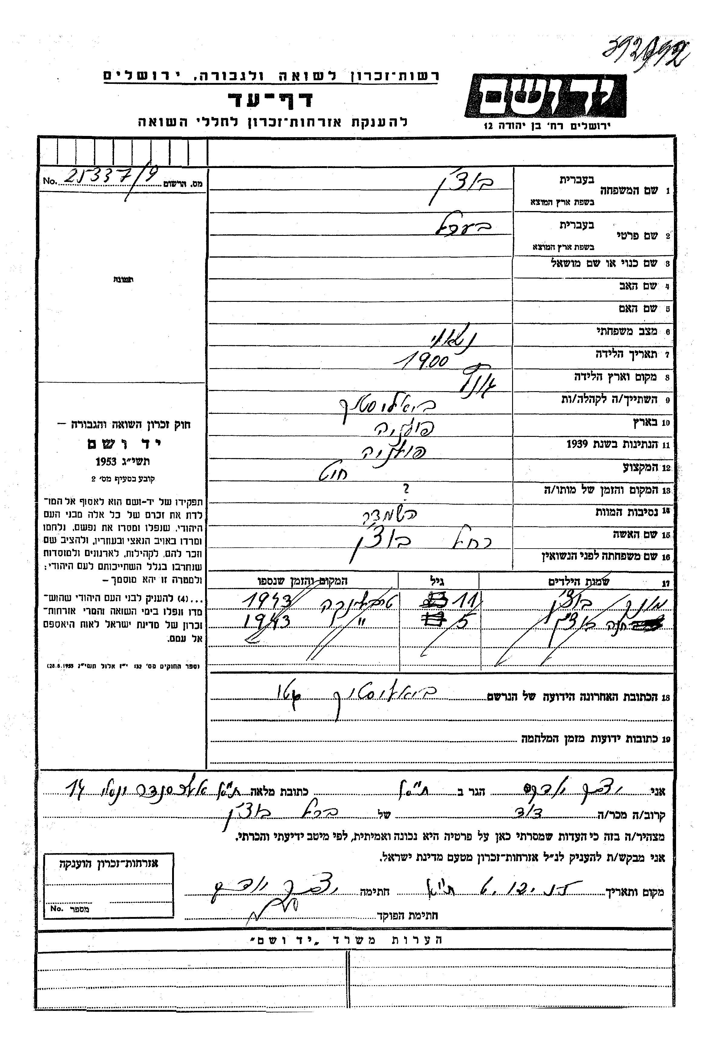 Berl Bochan was born in Gac, Poland, 1900. He was a tailor and married to Rakhel. Prior to WWII he lived in Bialystok, Poland. During the war he was in Bialystok, Poland. Berl was murdered in the Shoah.