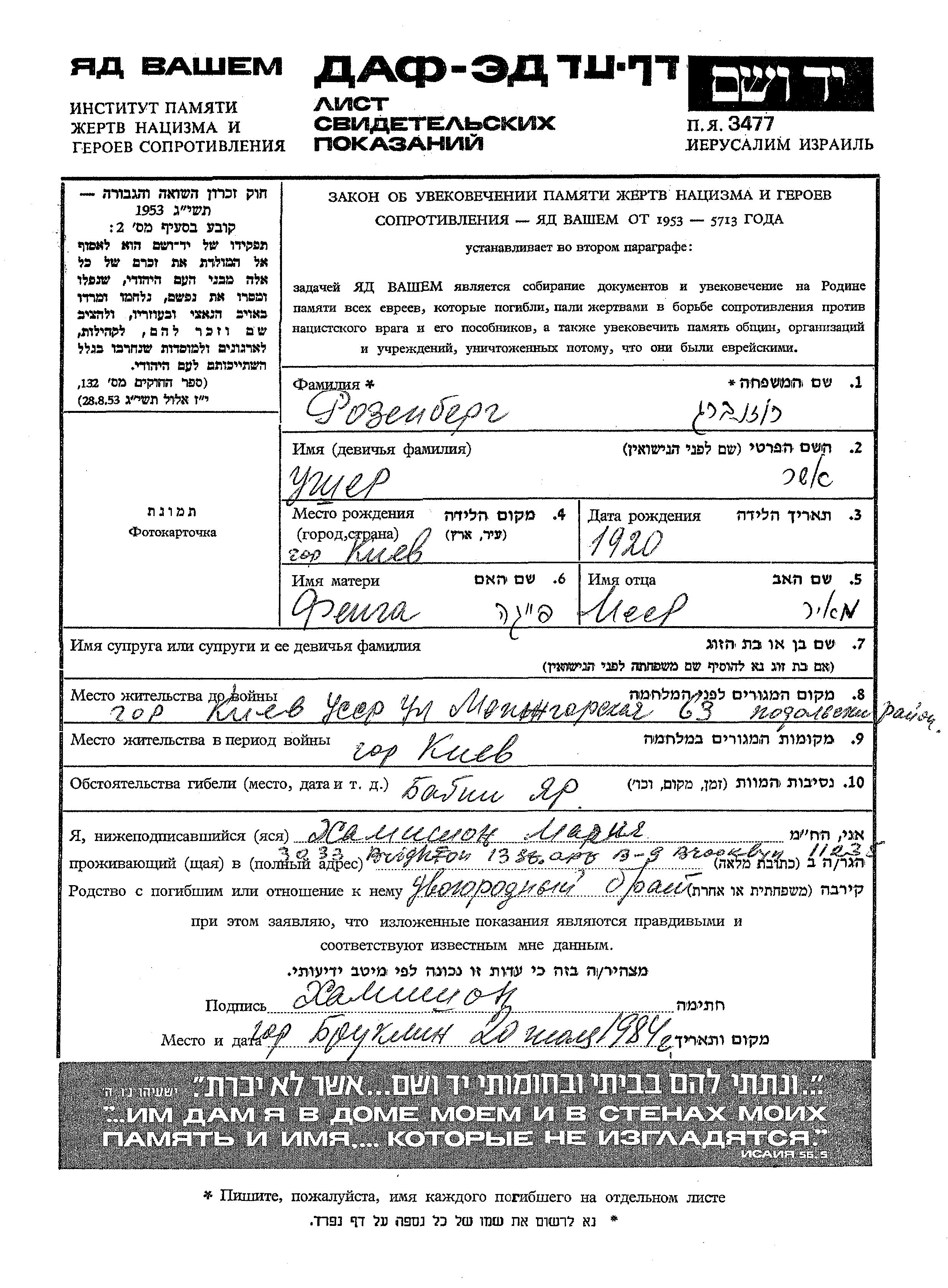 Rozenberg Usher 1920 Kiev, Ukraine (USSR) Page of Testimony
