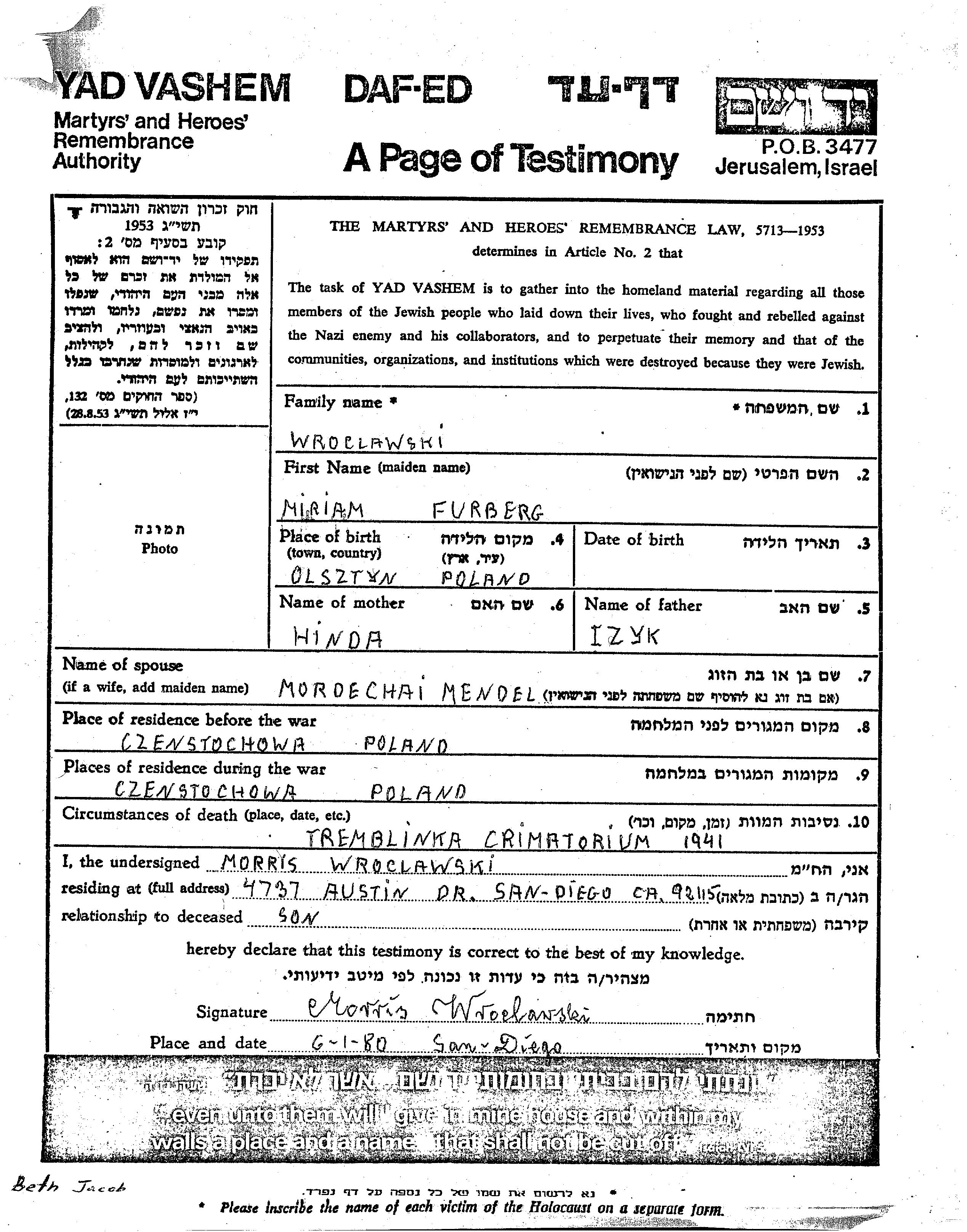 Miriam Wroclawski nee Furberg was born in Olsztyn, Poland to Izyk and Hinda. She was married to Mordechai Mendel. Prior to WWII she lived in Czenstochowa, Poland. During the war she was in Czenstochowa, Poland. Miriam was murdered in the Shoah. Place of death: Treblinka, Poland, 1941.
