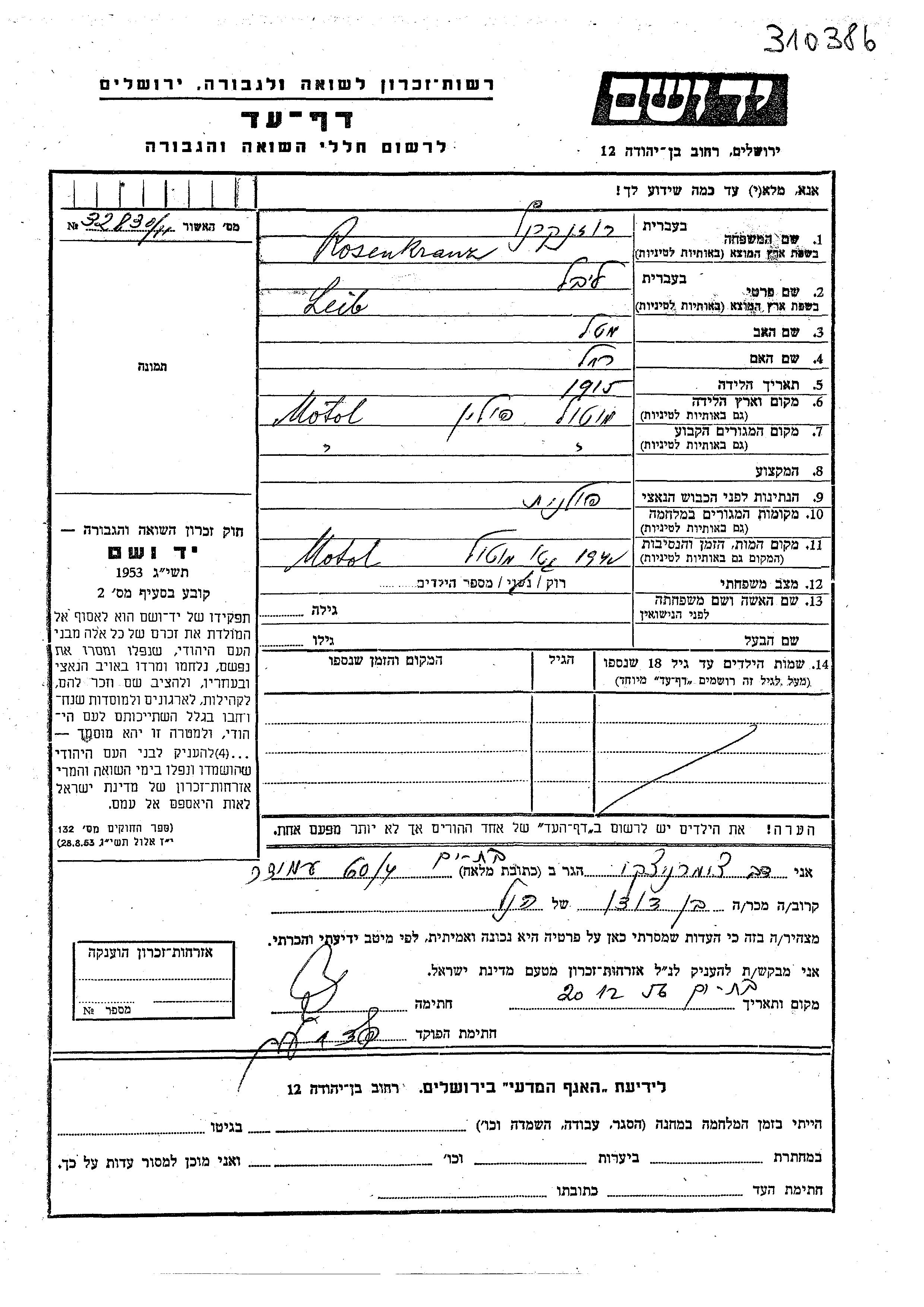 Leibel Rozenkranz was born in Motol, Poland, 1915 to Matl and Rakhel. He was single. Prior to WWII he lived in Motol, Poland. Leibel was murdered in the Shoah. Place of death: Motol, Poland, 1940.