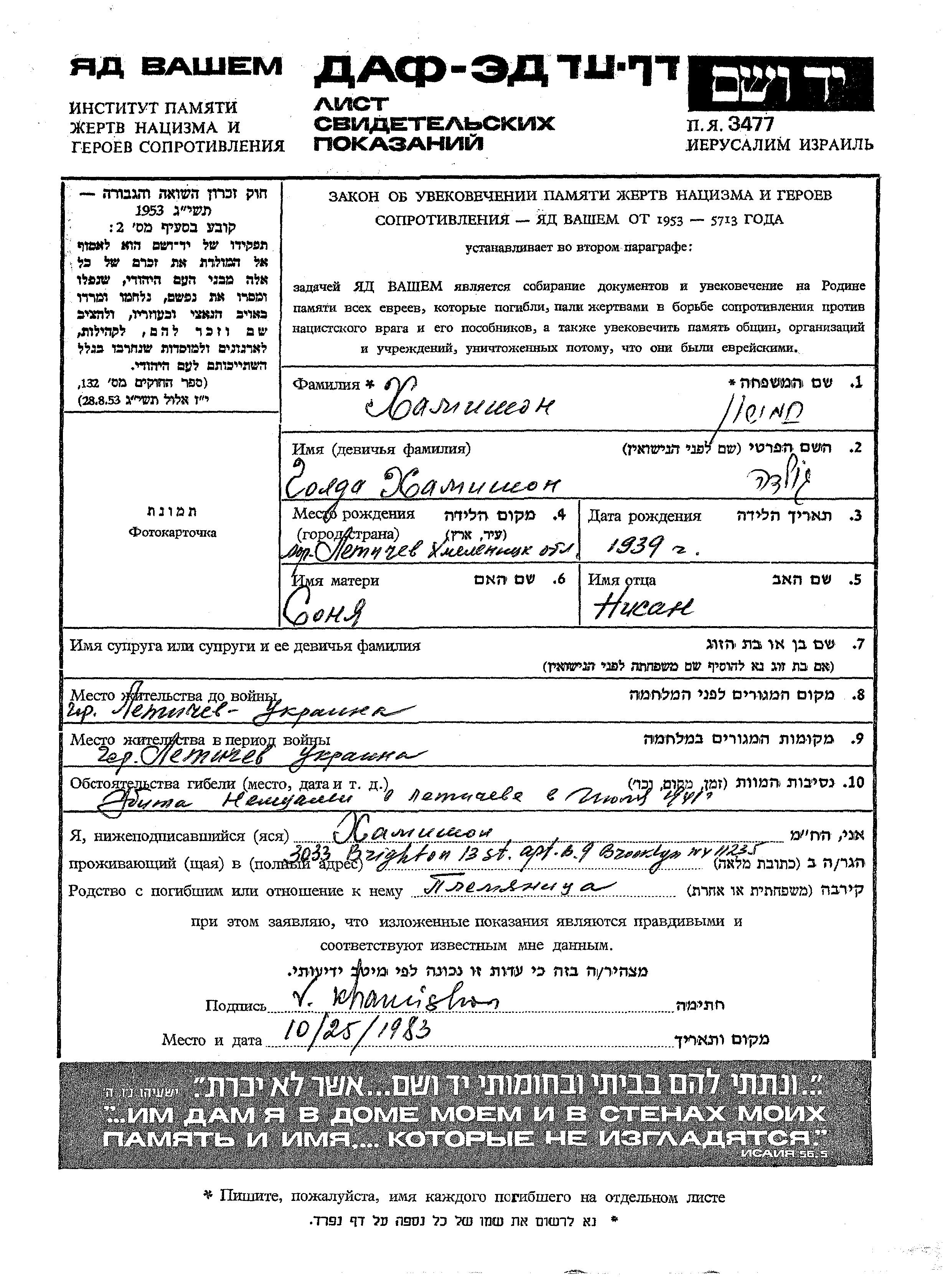 Khamishon Golda 1939 Letichev, Ukraine (USSR) Page of Testimony