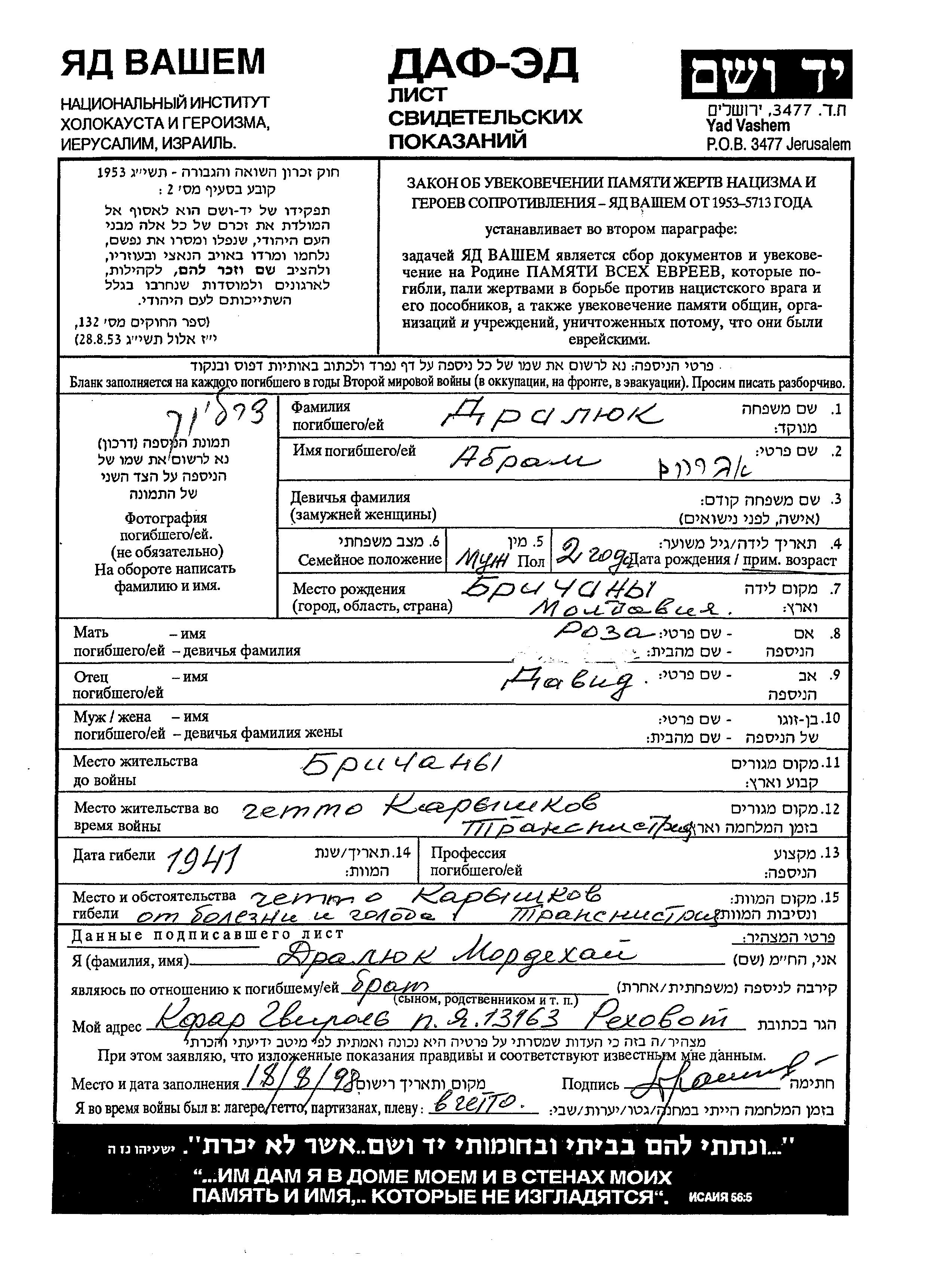 Abram Dralyuk was born in Brichany, Romania to David and Roza. Prior to WWII he lived in Brichany, Romania. During the war he was in Karyshkov, Ukraine (USSR). Abram was murdered in the Shoah. Place of death: Karyshkov, Ukraine (USSR), 1941.