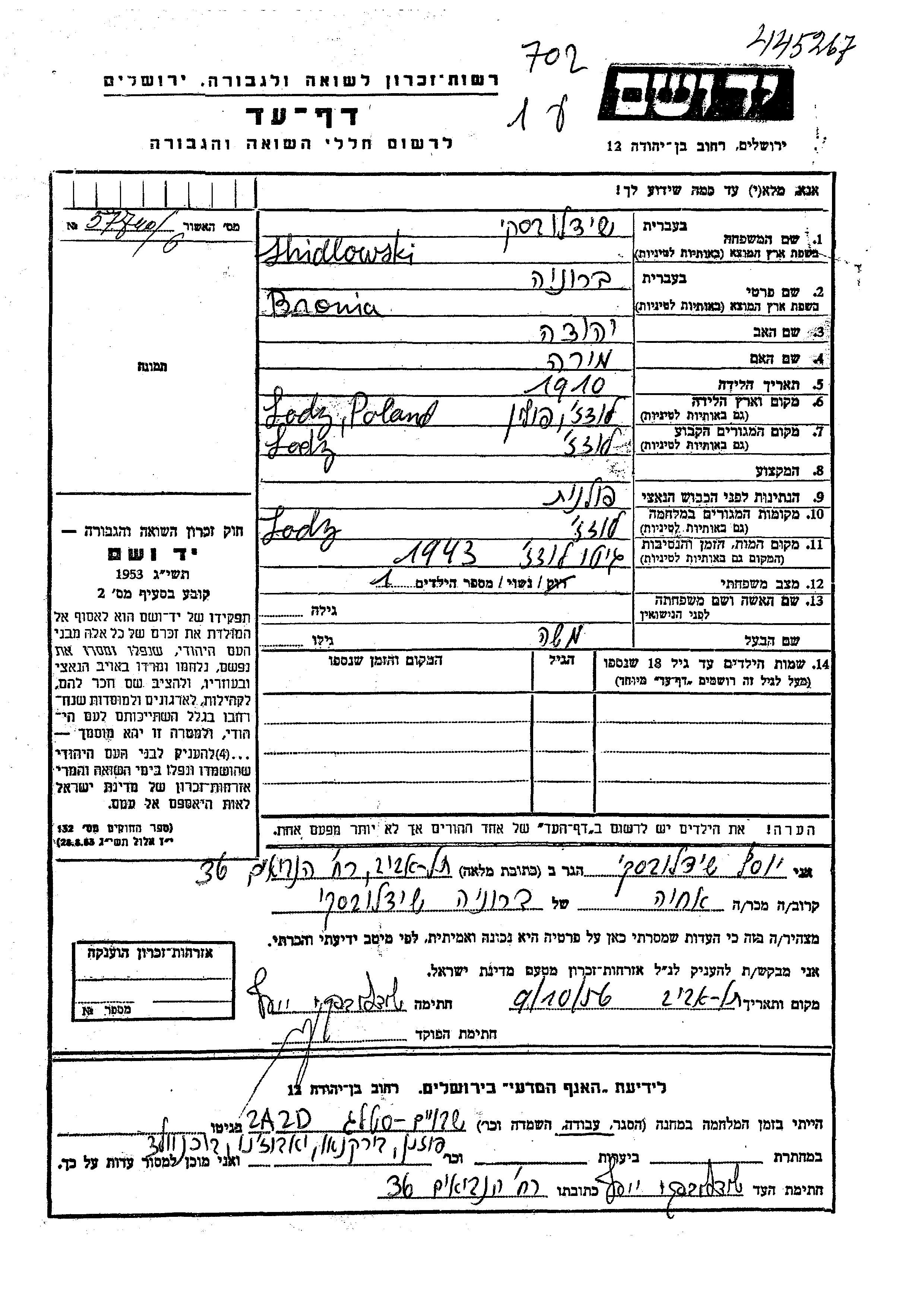 Shidlowski Bronia 1910 Lodz, Poland Page of Testimony
