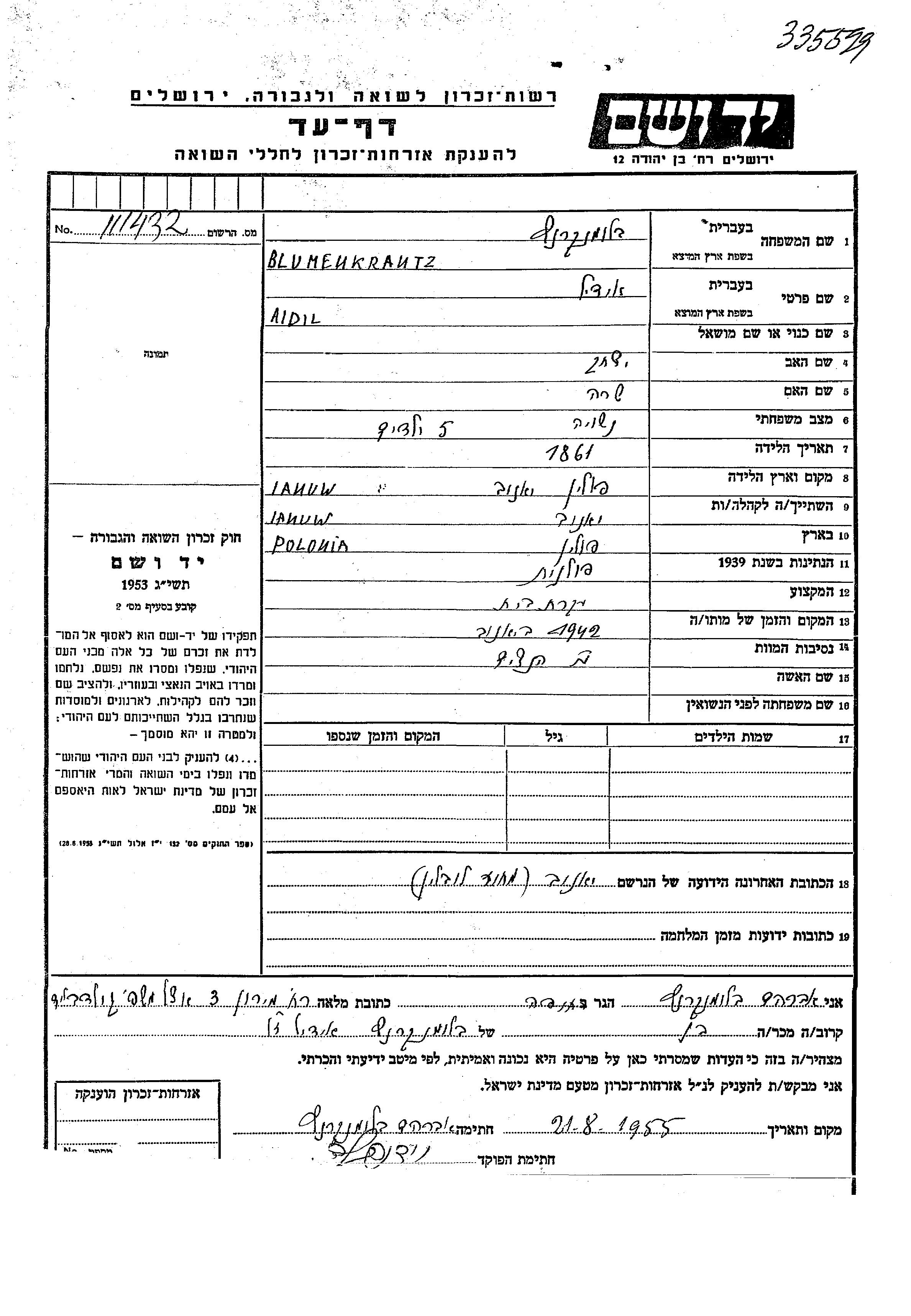 Blumenkrantz Aidil Idil 1861 Poland Page of Testimony