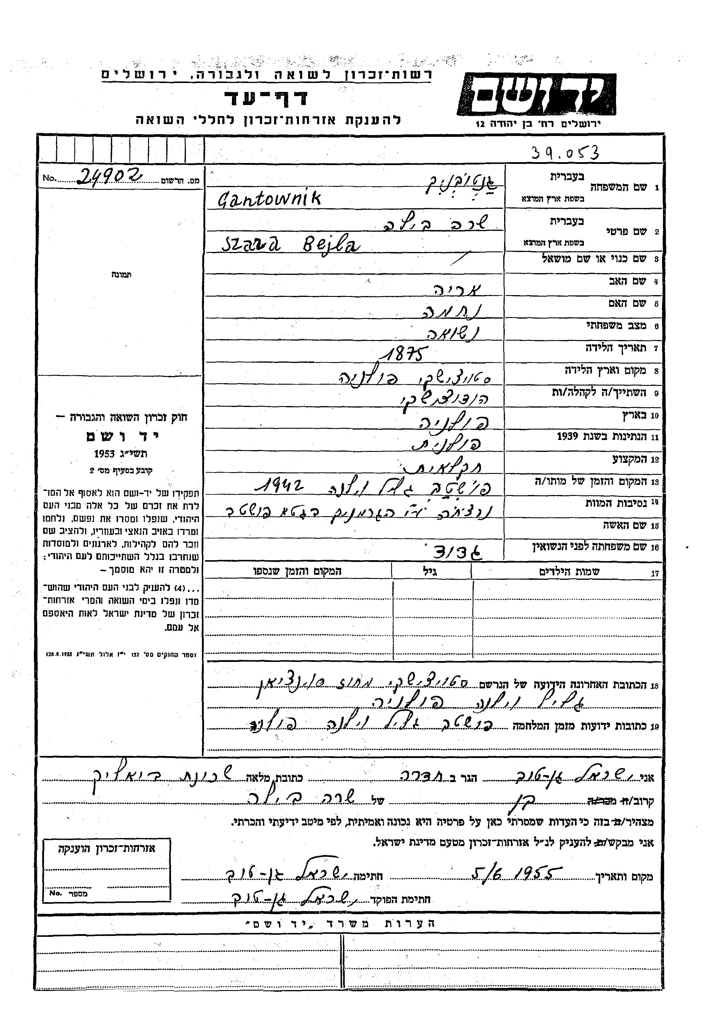 Szara Bejla Gantownik nee Gdud was born in Stojaciszki, Poland, 1875 to Arie and Nekhama. She was an agriculturist and married. Prior to WWII she lived in Stojaciszki, Poland. During the war she was in Stojaciszki, Poland. Szara Bejla was murdered in the Shoah. Place of death: Postawy, Poland, 1942.