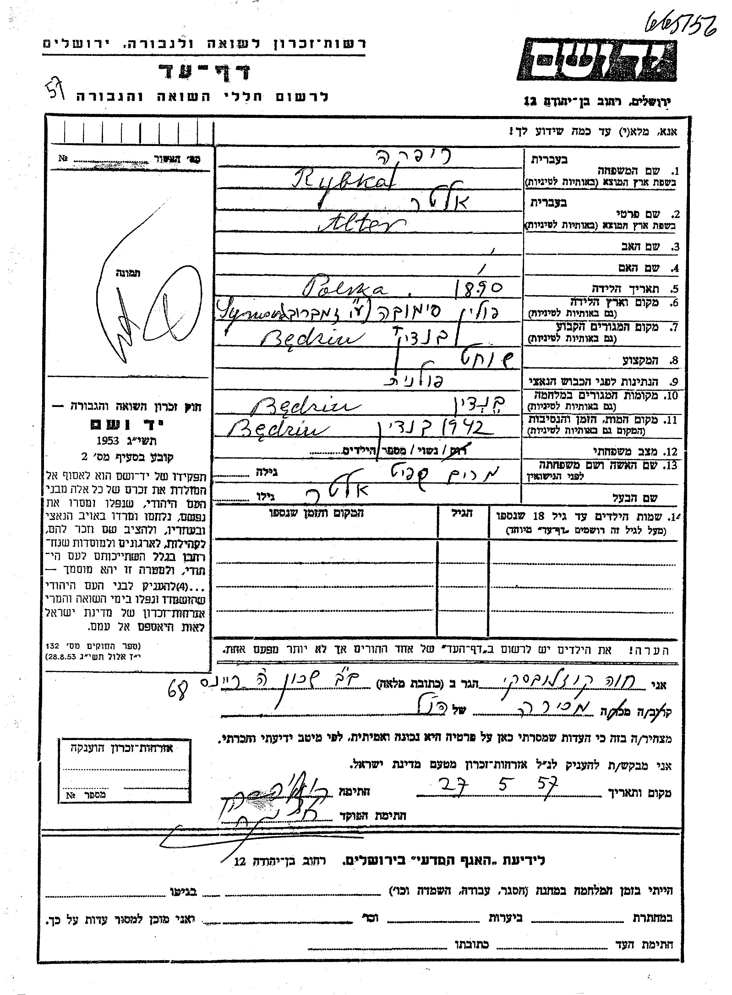 Rybka Ripka Alter 1890 Bendzin, Poland Page of Testimony