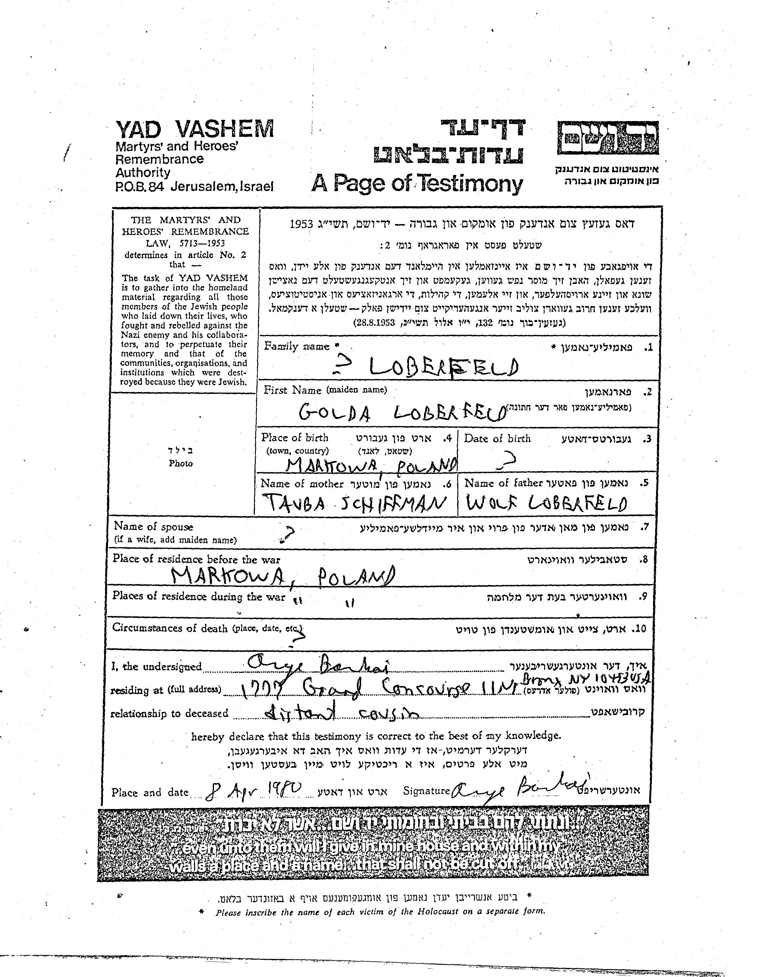 Golda Loberfeld was born in Markowa, Poland to Wolf and Tauba. Prior to WWII she lived in Markowa, Poland. During the war she was in Markowa, Poland. Golda was murdered in the Shoah.