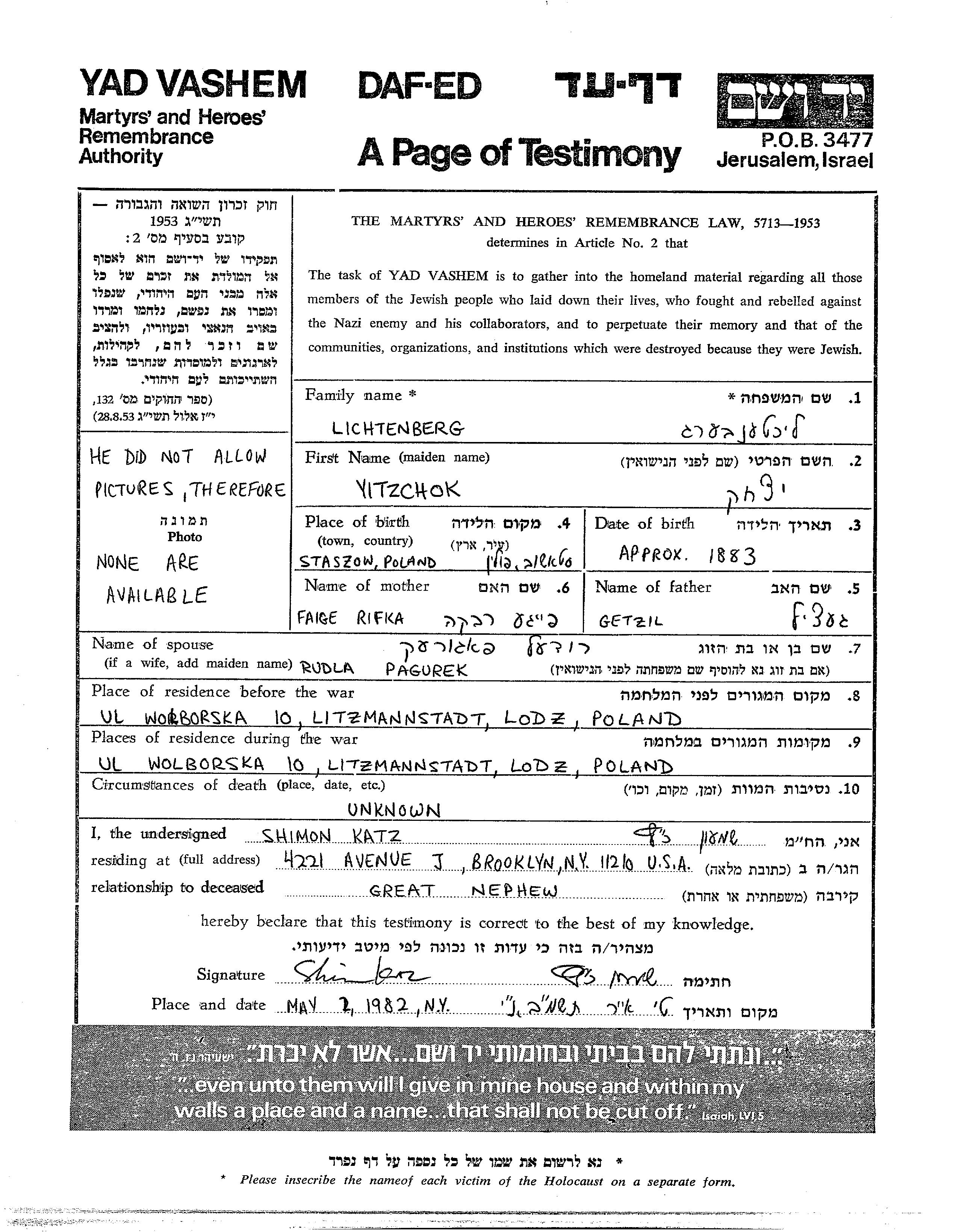 Lichtenberg Yitzchok 1883 Lodz, Poland Page of Testimony