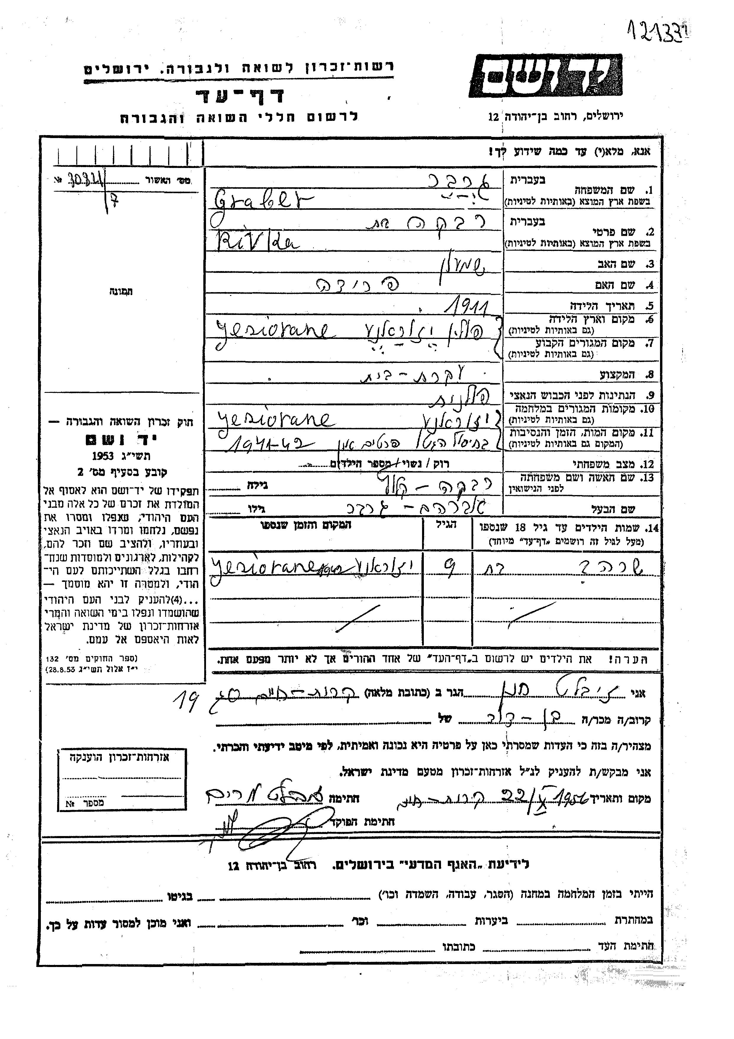 Rivka Graber nee Klotz was born in Jeziorany, Poland, 1911 to Shimon and Frida. She was a housewife and married to Avraham. Prior to WWII she lived in Jeziorany, Poland. During the war she was in Jeziorany, Poland. Rivka was murdered in the Shoah. Place of death: Jeziorany, Poland, 1941.