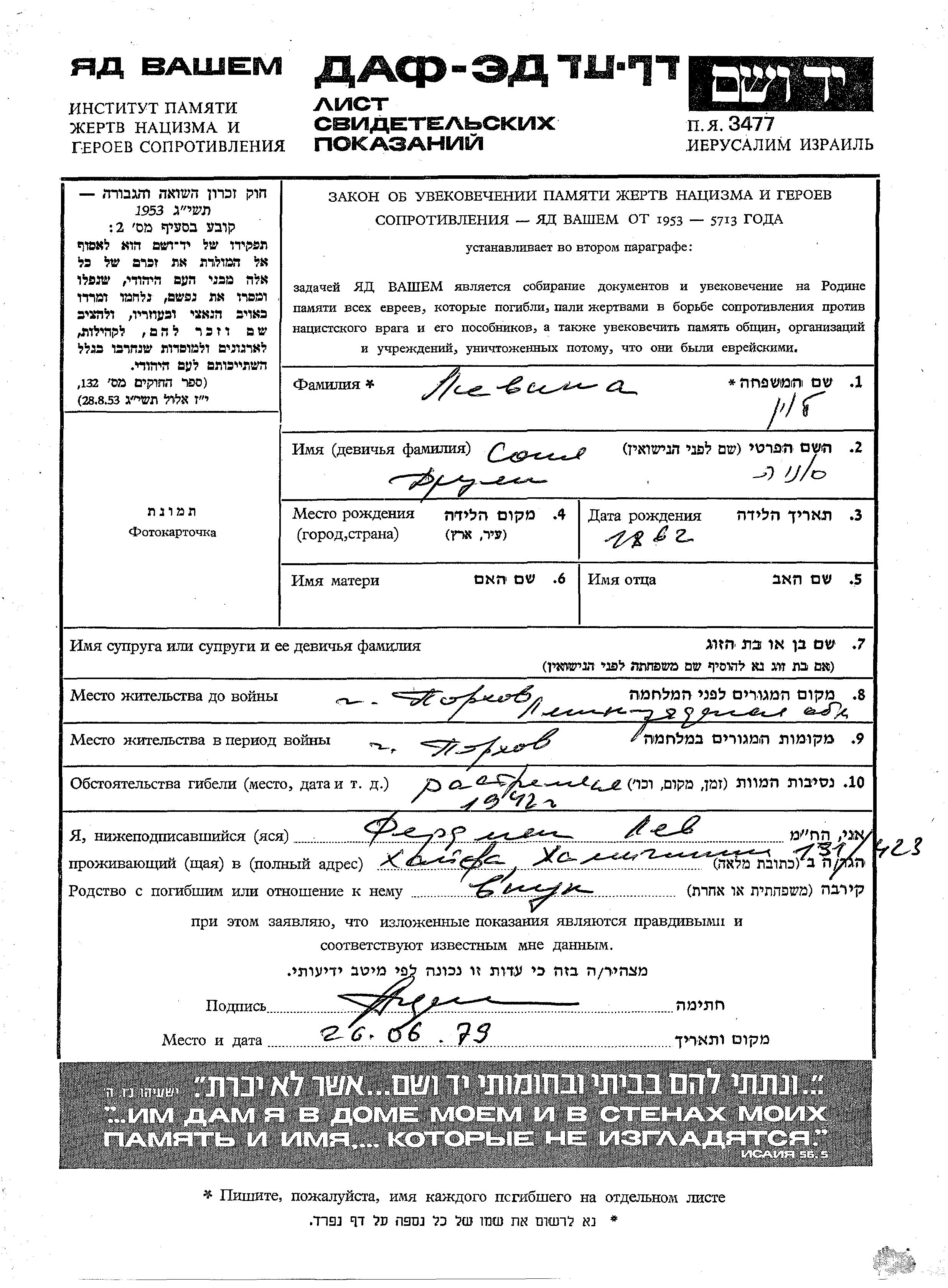 Sonia Levina nee Druyan was born, 1862. Prior to WWII she lived in Porkhov, Russia (USSR). During the war she was in Porkhov, Russia (USSR). Sonia was murdered in the Shoah. Place of death: unknown, 1942.