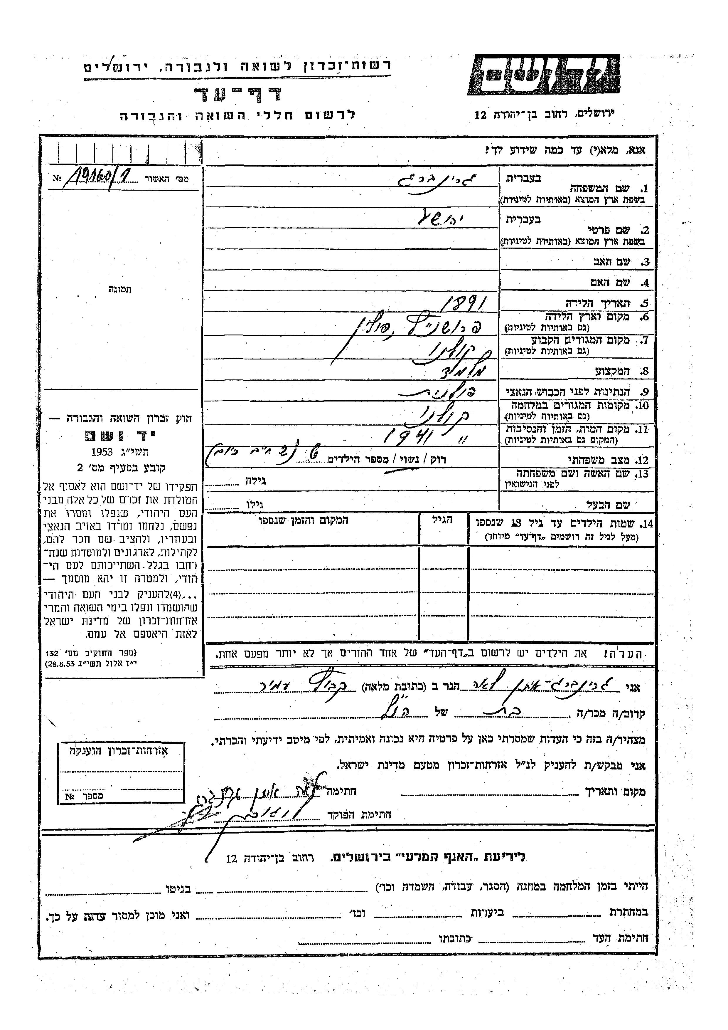Yehoshua Grinberg was born in Proshnits, Poland, 1891. He was a religious teacher and married. Prior to WWII he lived in Kolno, Poland. During the war he was in Kolno, Poland. Yehoshua was murdered in the Shoah. Place of death: Kolno, Poland, 1941.