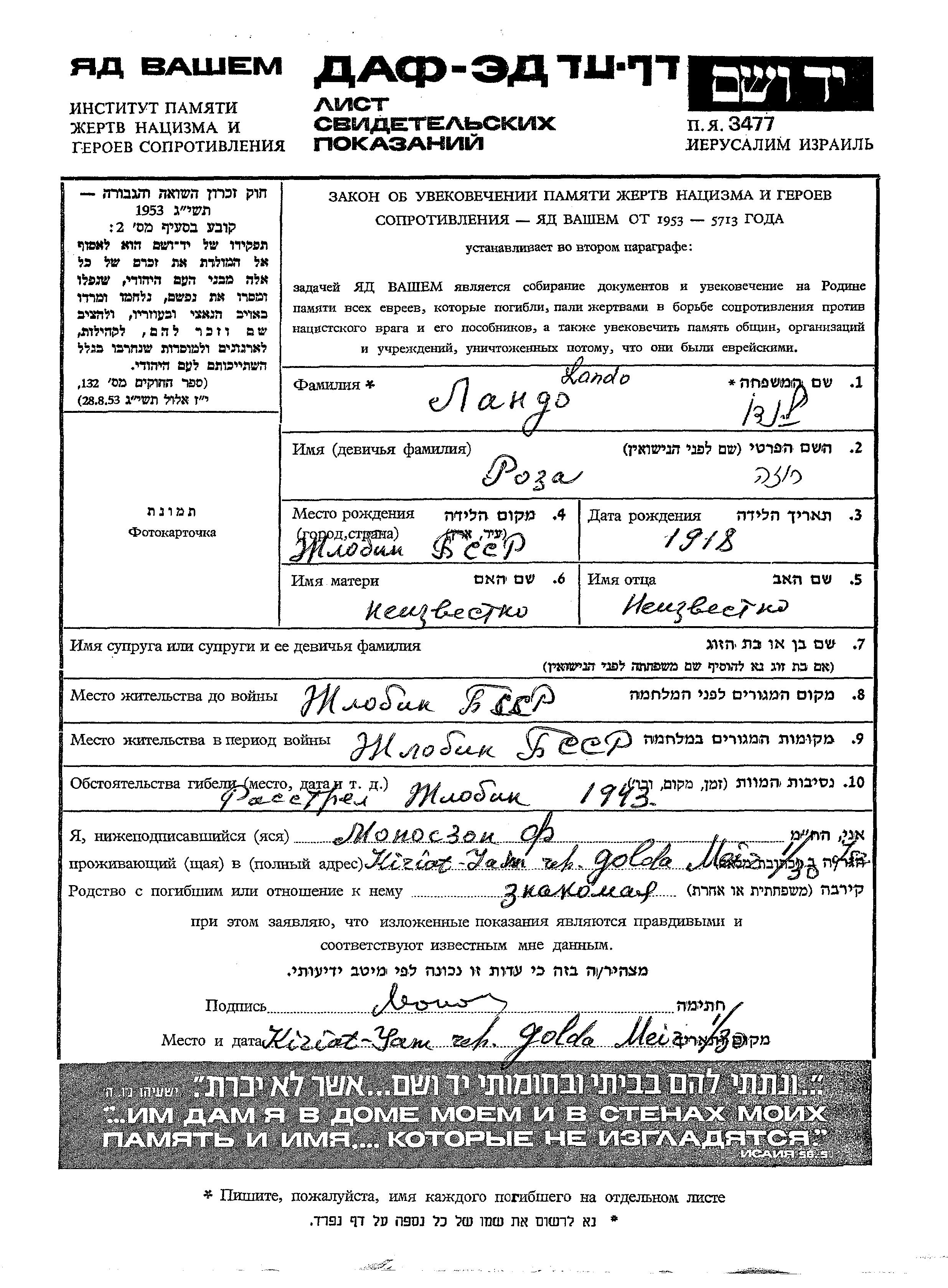 Lando Roza 1918 Zlobin, Belorussia (USSR) Page of Testimony