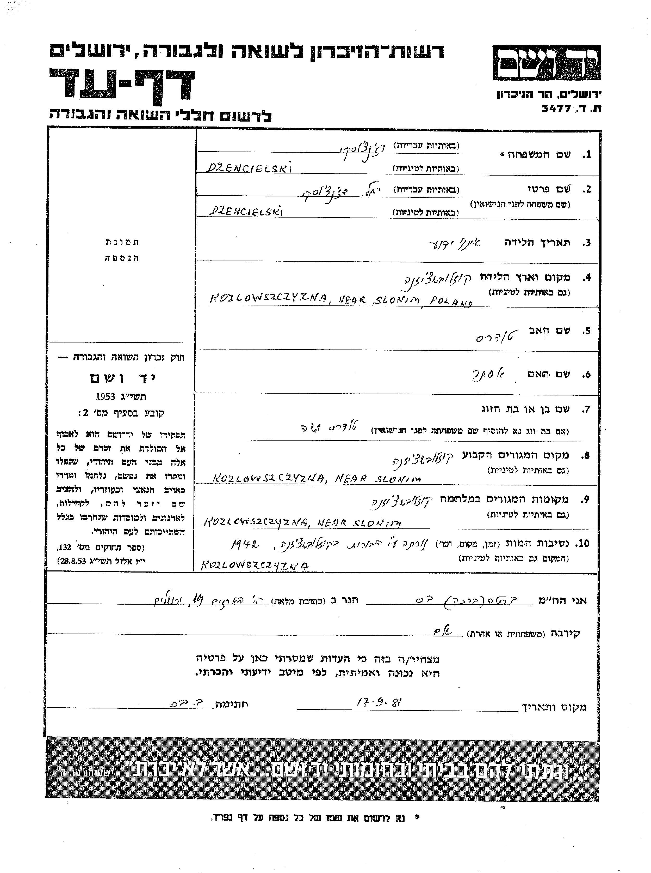 Rakhel Dzencielski was born in Kozlowszczyzna, Poland to Todres and Ester. She was married to Todres Moshe. Prior to WWII she lived in Kozlowszczyzna, Poland. During the war she was in Kozlowszczyzna, Poland. Rakhel was murdered in the Shoah. Place of death: Kozlowszczyzna, Poland, 1942.