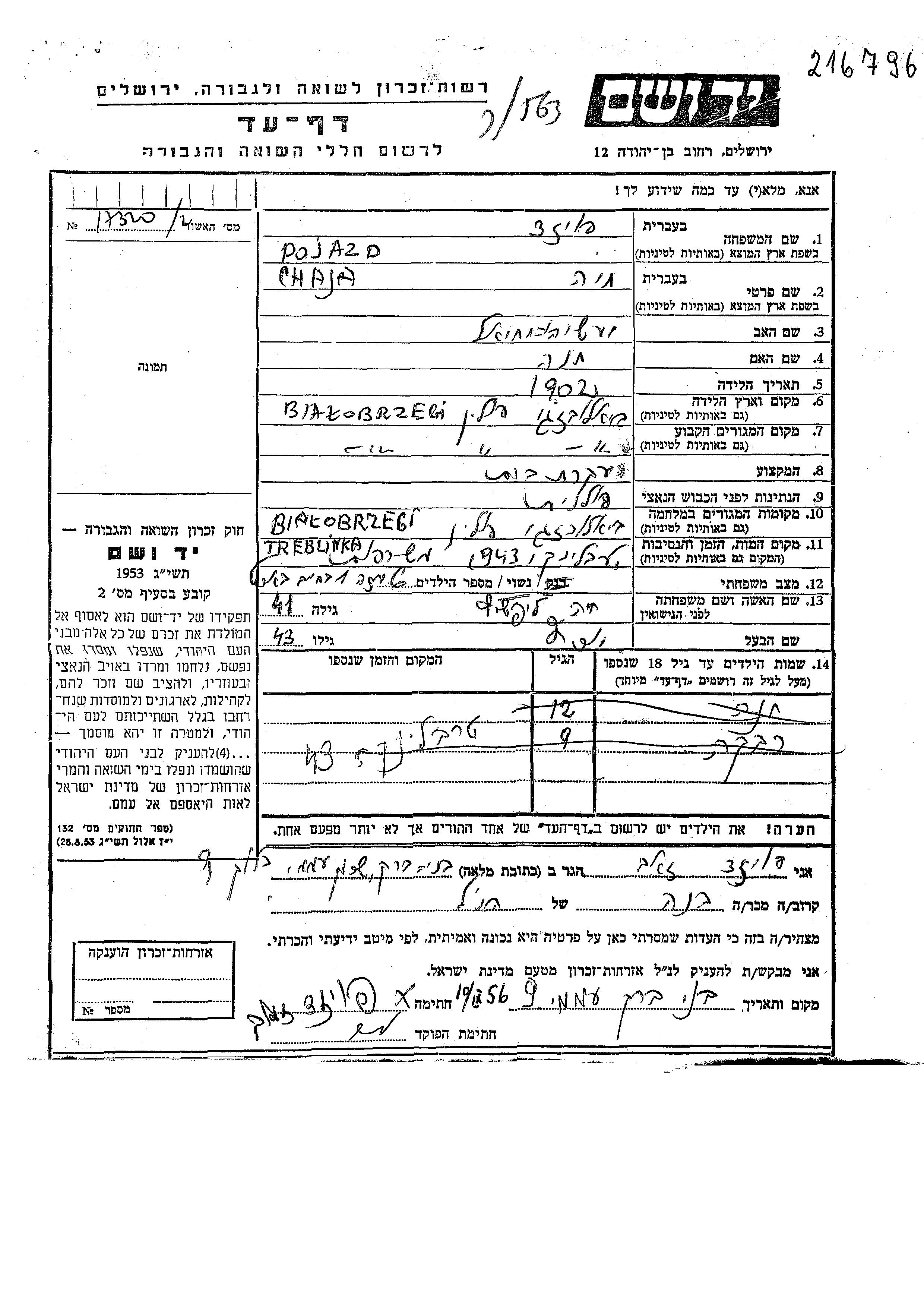Chaja Pojazd nee Lifshitz was born in Bialobrzegi, Poland, 1902 to Yeshayahu Yekhiel and Khana. She was a housewife and married to Yosef. Prior to WWII she lived in Bialobrzegi, Poland. During the war she was in Bialobrzegi, Poland. Chaja was murdered in the Shoah. Place of death: Treblinka, Poland, 1943.