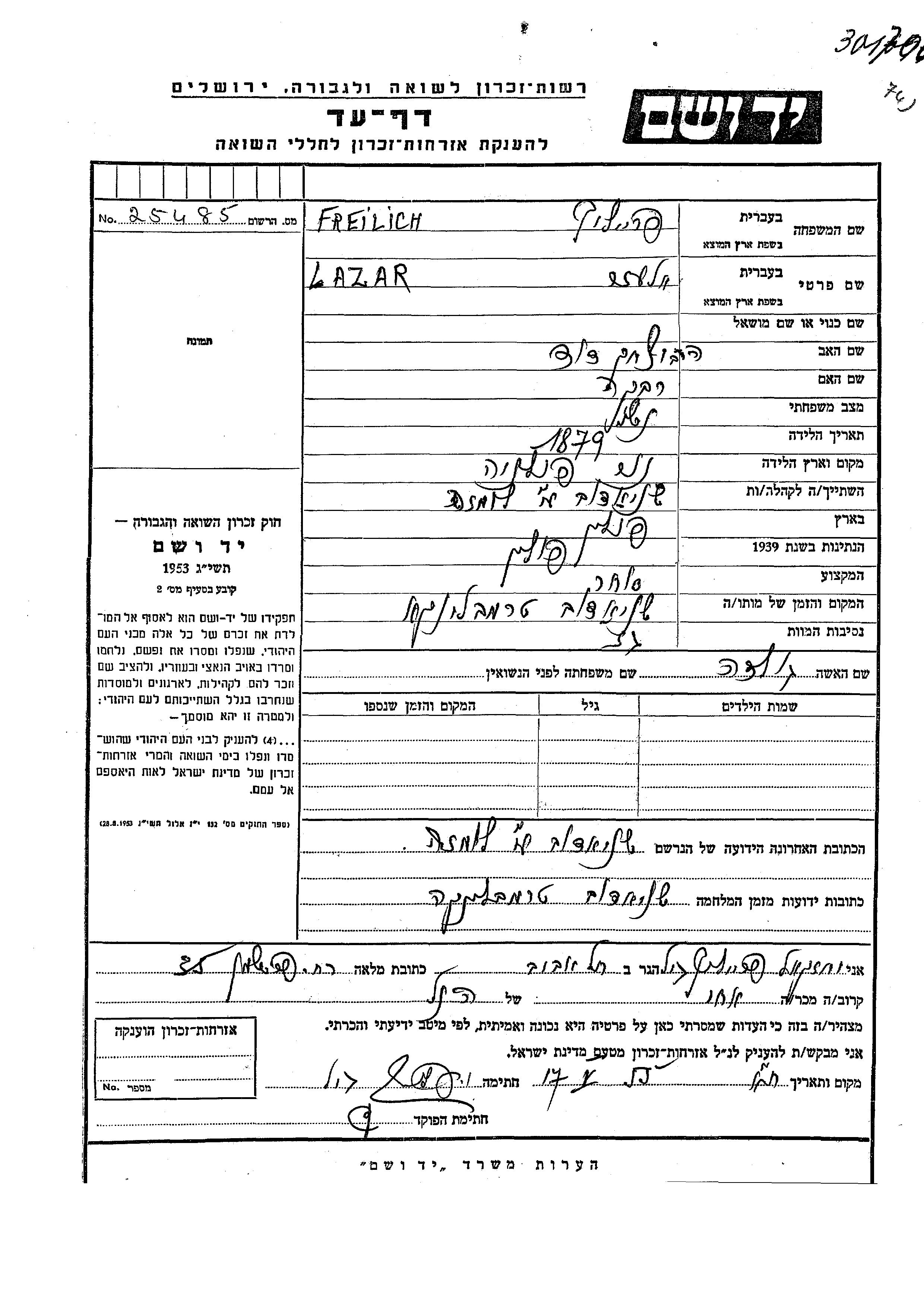 Lazar Freilich was born in Nur, Poland, 1879 to Yitzkhak David and Rivka. He was a merchant and married to Golda. Prior to WWII he lived in Sniadowo, Poland. During the war he was in Treblinka, Poland. Lazar was murdered in the Shoah. Place of death: Treblinka, Poland.