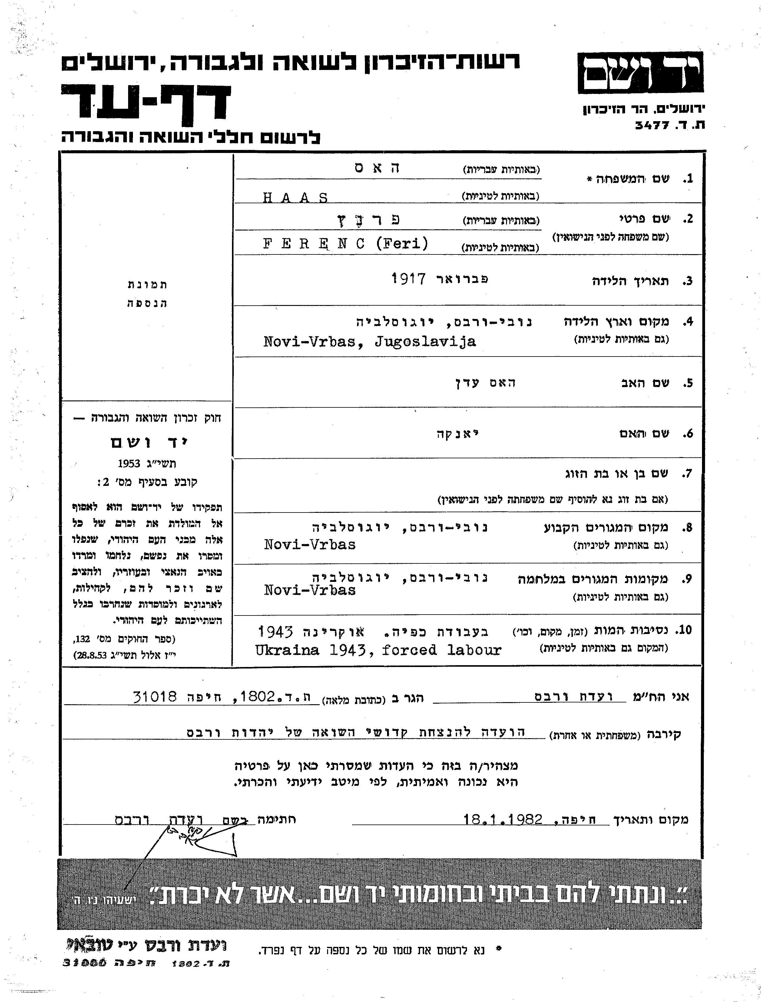 Haas Feri 1917 Novi Vrbas, Yugoslavia Page of Testimony
