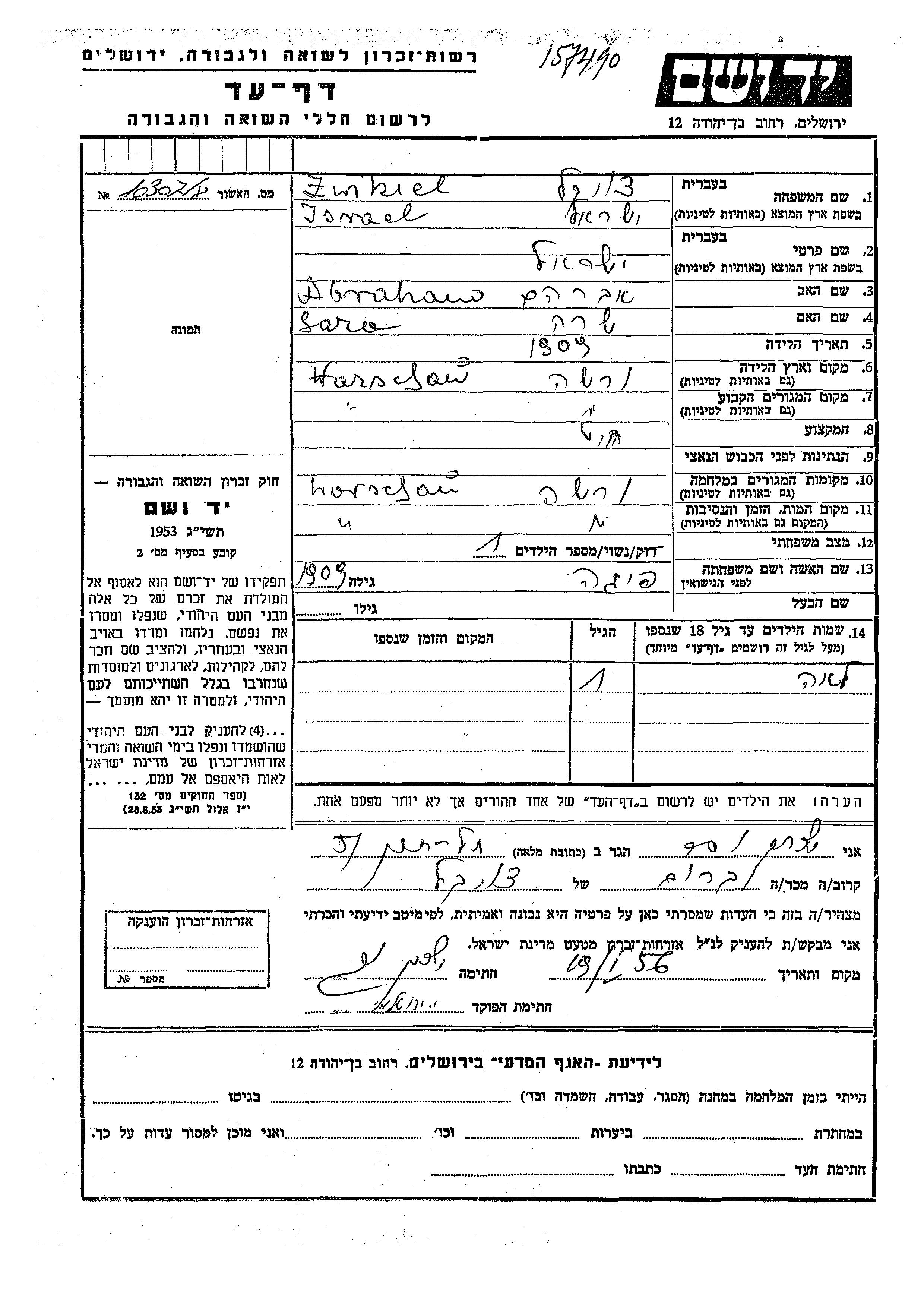 Zwikiel Israel 1909 Warszawa, Poland Page of Testimony