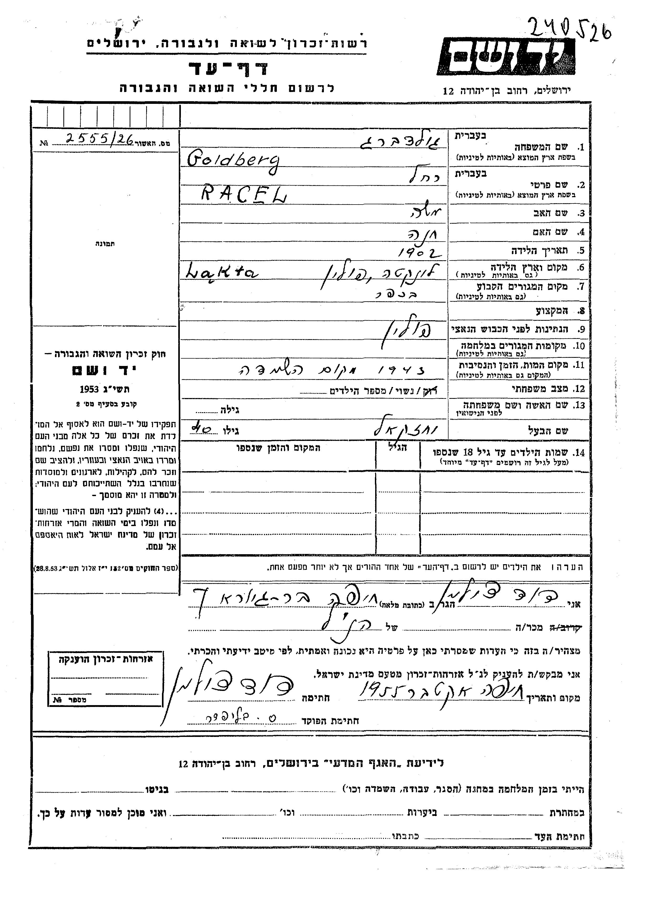 Racel Goldberg was born in Lakta, Poland, 1902 to Moshe and Khana. She was married to Yekhezkel.