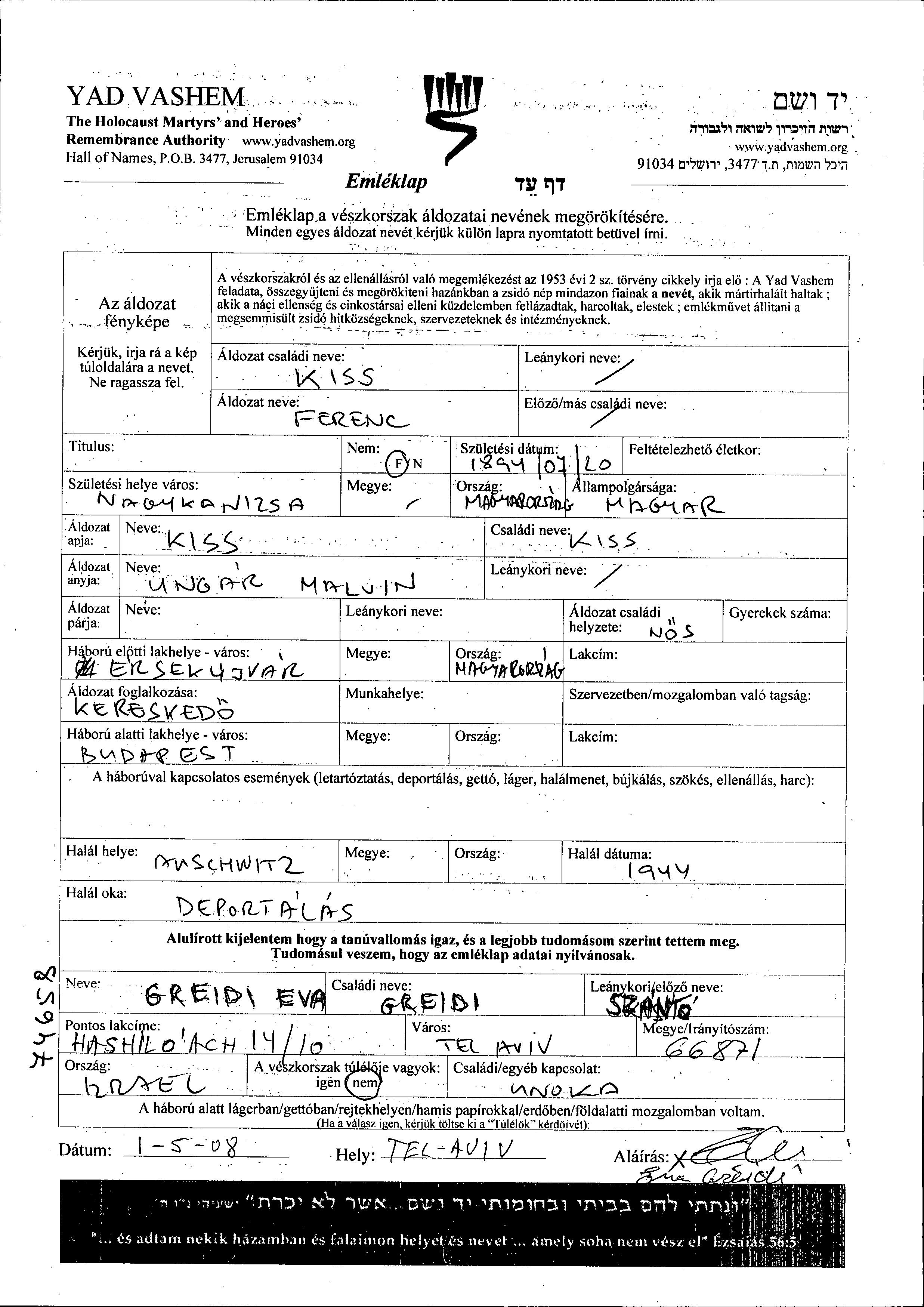 Kiss Ferenc 1894 Ersekujvar, Czechoslovakia Page of Testimony