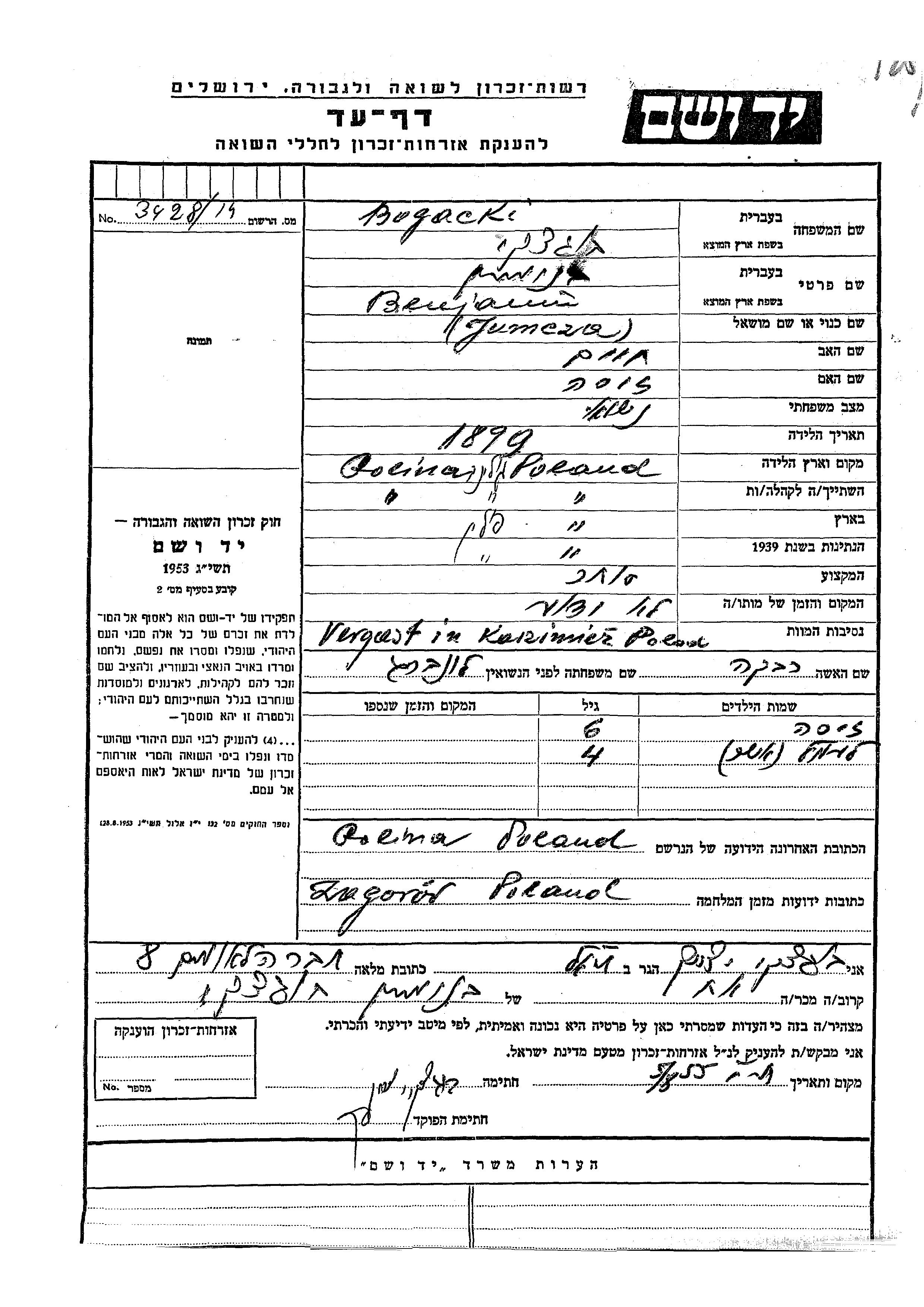 Benjamin Bogacki was born in Golina, Poland, 1899 to Chaim and Zisa. He was a merchant and married to Rivka nee Levenberg. Prior to WWII he lived in Golina, Poland. During the war he was in Zagorow, Poland. Benjamin was murdered in the Shoah. Place of death: Kazimierz, Poland.