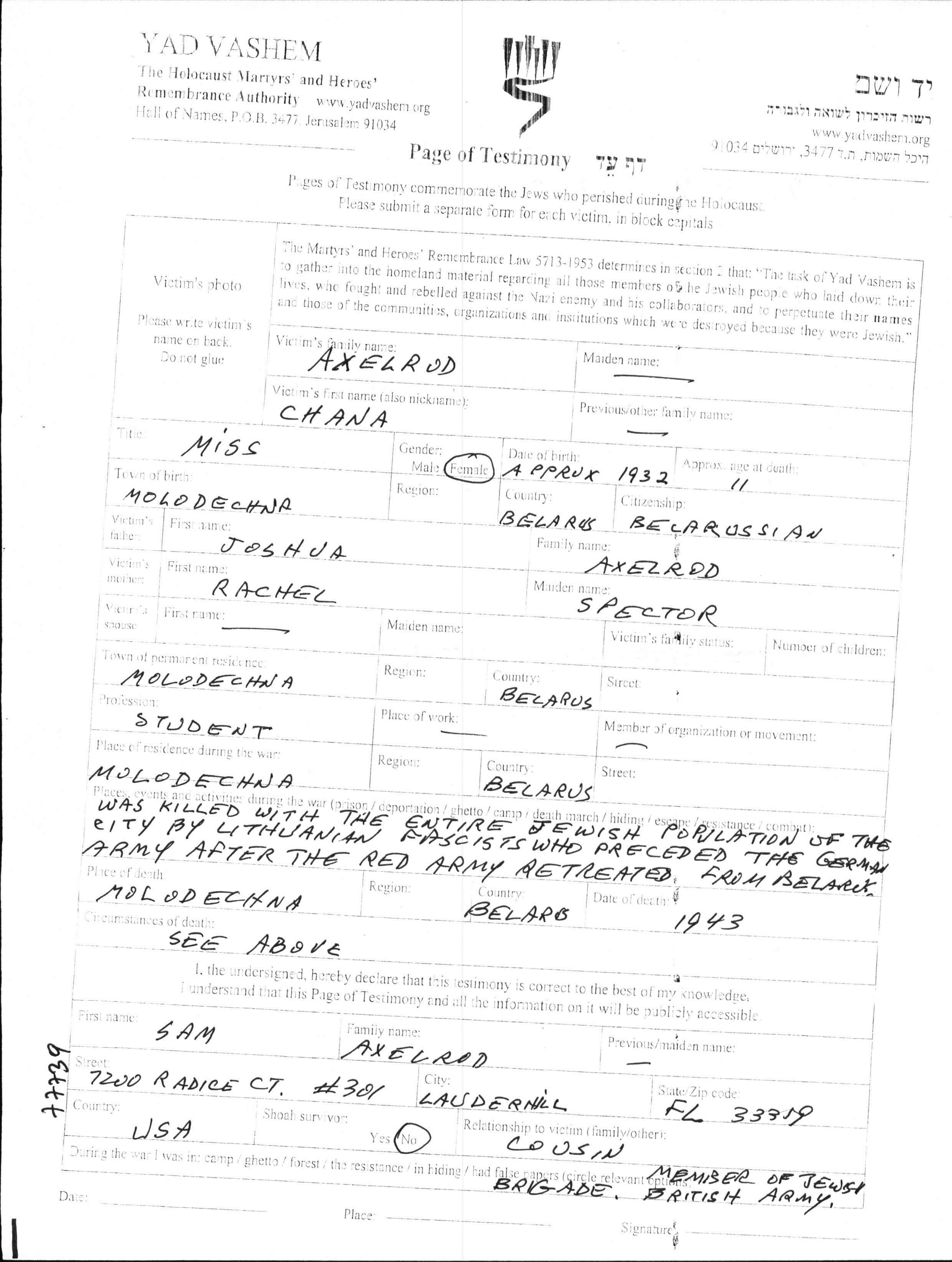 Chana Axelrod was born in Molodeczno, Poland, 1932 to Joshua and Rachel nee Spector. She was a pupil and child. Prior to WWII she lived in Molodeczno, Poland. During the war she was in Molodeczno, Poland. Chana was murdered in the Shoah. Place of death: Molodeczno, Poland, 1943.