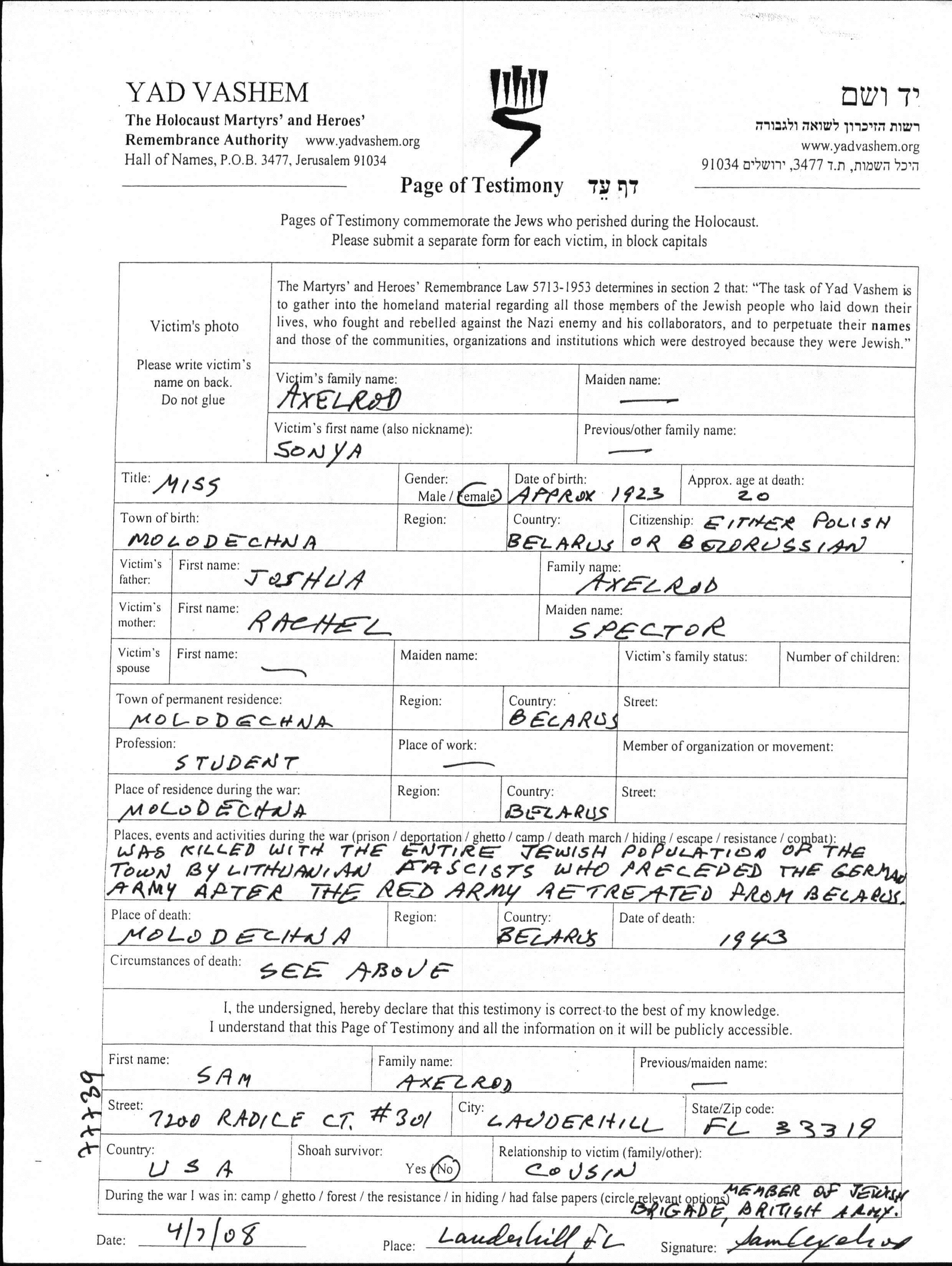 Sonya Axelrod was born in Molodeczno, Poland, 1923 to Joshua and Rachel nee Spector. She was a student. Prior to WWII she lived in Molodeczno, Poland. During the war she was in Molodeczno, Poland. Sonya was murdered in the Shoah. Place of death: Molodeczno, Poland, 1943.