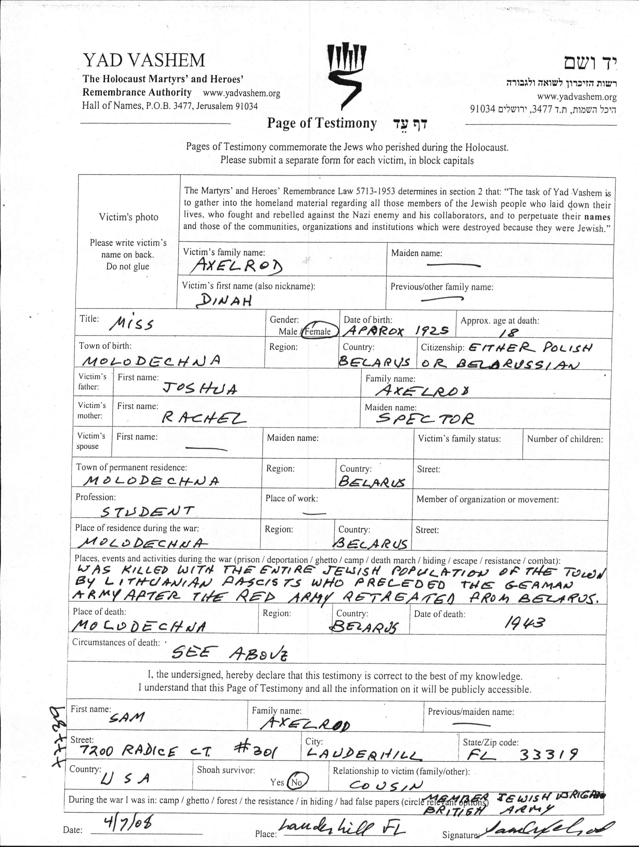 Dinah Axelrod was born in Molodeczno, Poland, 1925 to Joshua and Rachel nee Spector. She was a student and single. Prior to WWII she lived in Molodeczno, Poland. During the war she was in Molodeczno, Poland. Dinah was murdered in the Shoah. Place of death: Molodeczno, Poland, 1943.