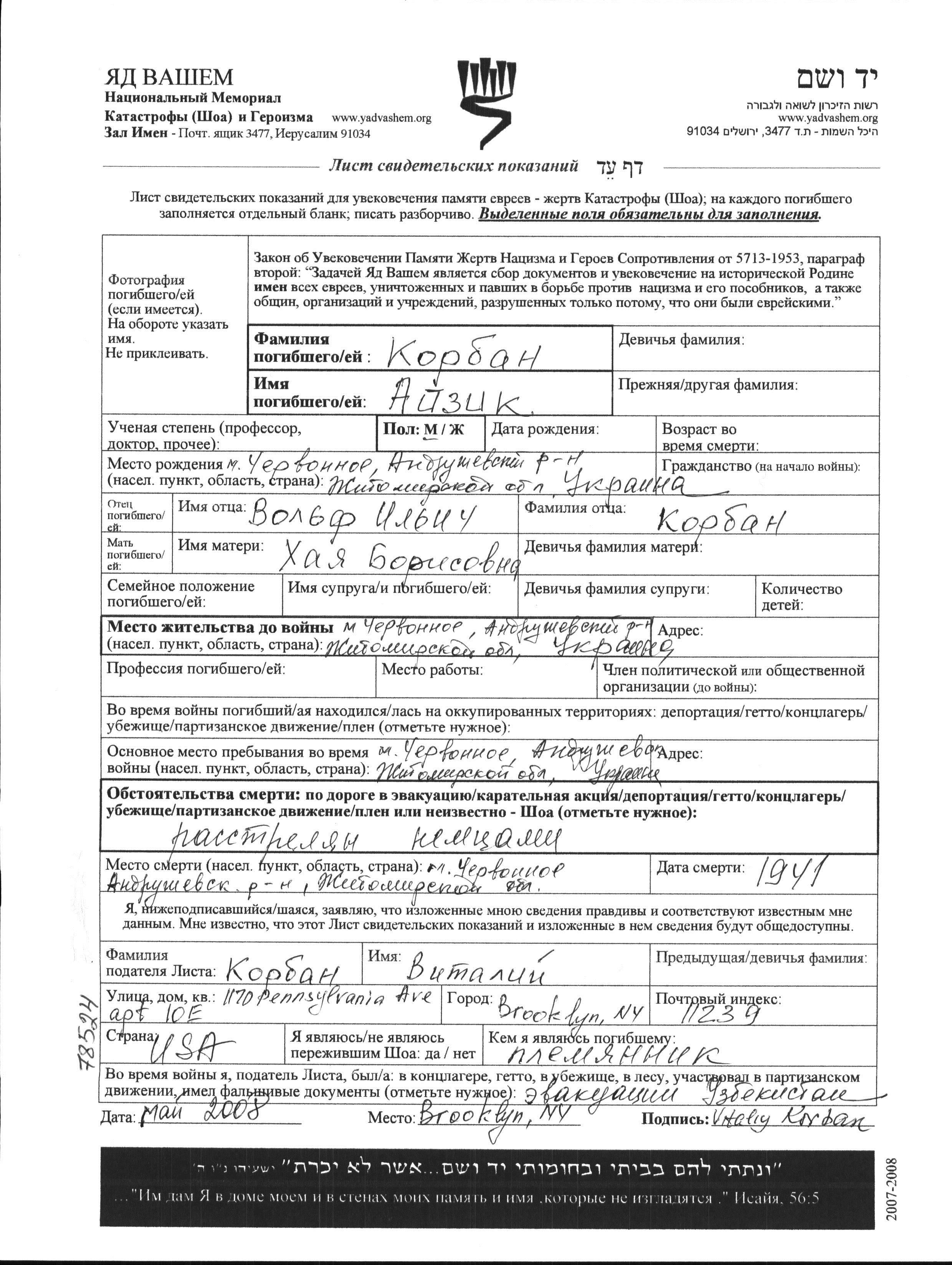 Aizik Korban was born in Chervone, Ukraine (USSR) to Volf and Khaya. Prior to WWII he lived in Chervone, Ukraine (USSR). During the war he was in Chervone, Ukraine (USSR). Aizik was murdered in the Shoah. Place of death: Chervone, Ukraine (USSR), 1941.