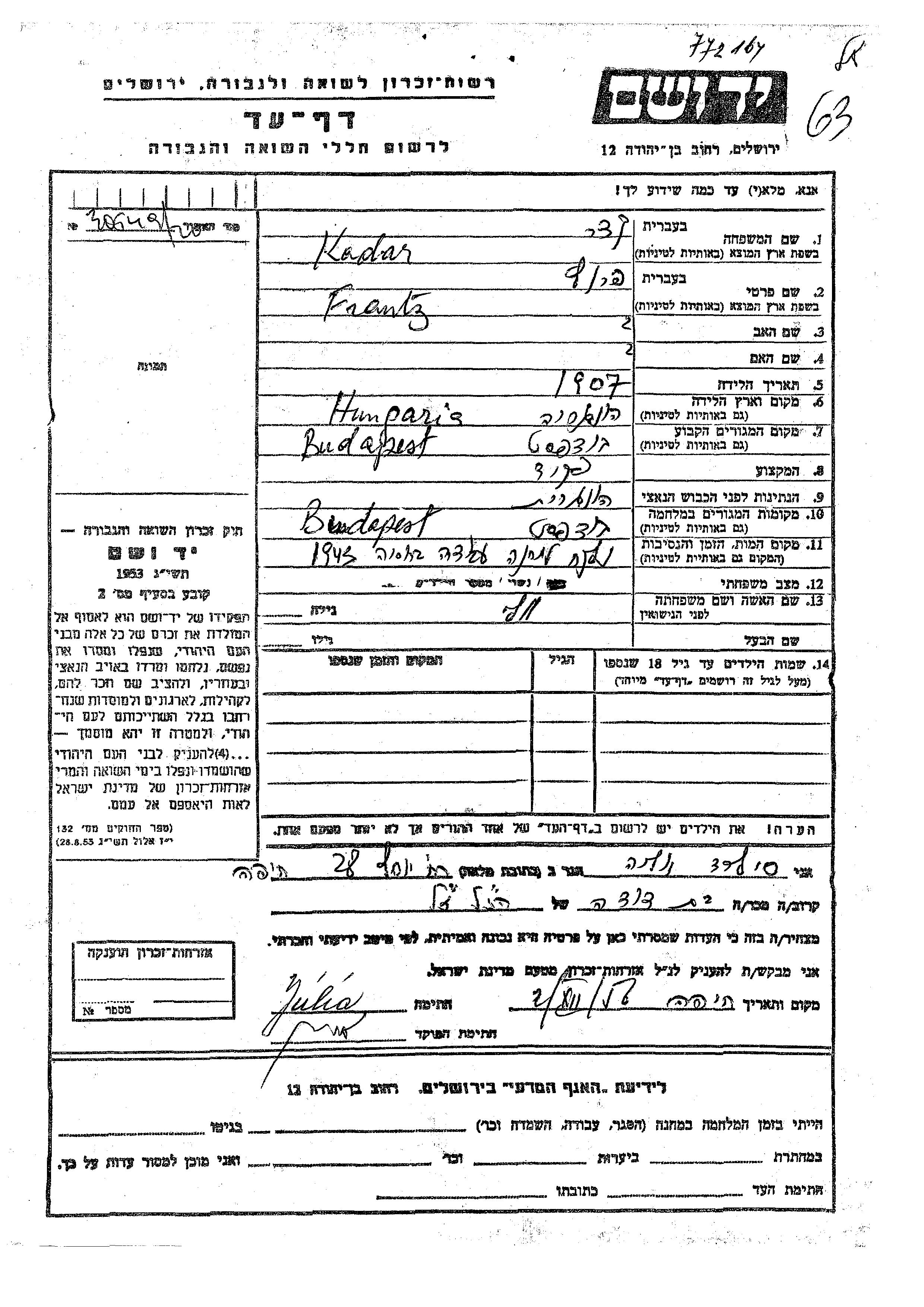 Kadar Ferentz 1907 Budapest, Hungary Page of Testimony