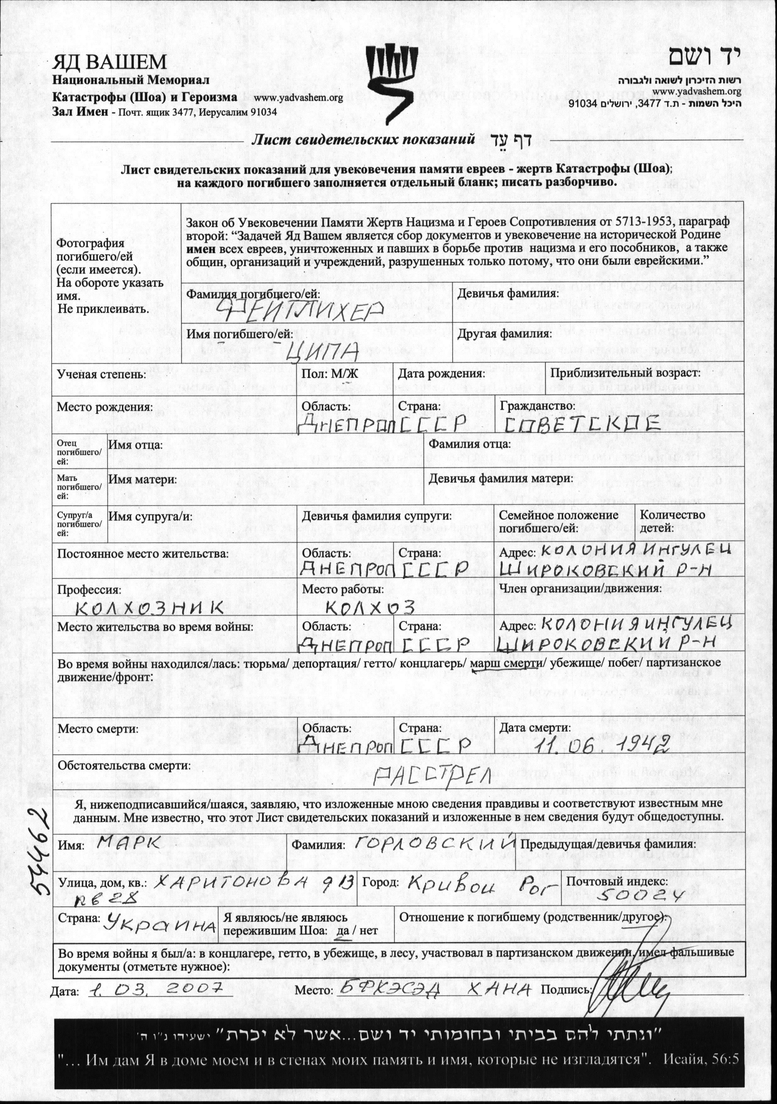 Tzipa Feitlikher was born in Dnepropetrovsk, Ukraine (USSR). She was a kolkhoznik / kolkhoznitza. Prior to WWII she lived in Ingulets, Ukraine (USSR). During the war she was in Ingulets, Ukraine (USSR). Tzipa was murdered in the Shoah. Place of death: Dnepropetrovsk, Ukraine (USSR), 11/06/1942.