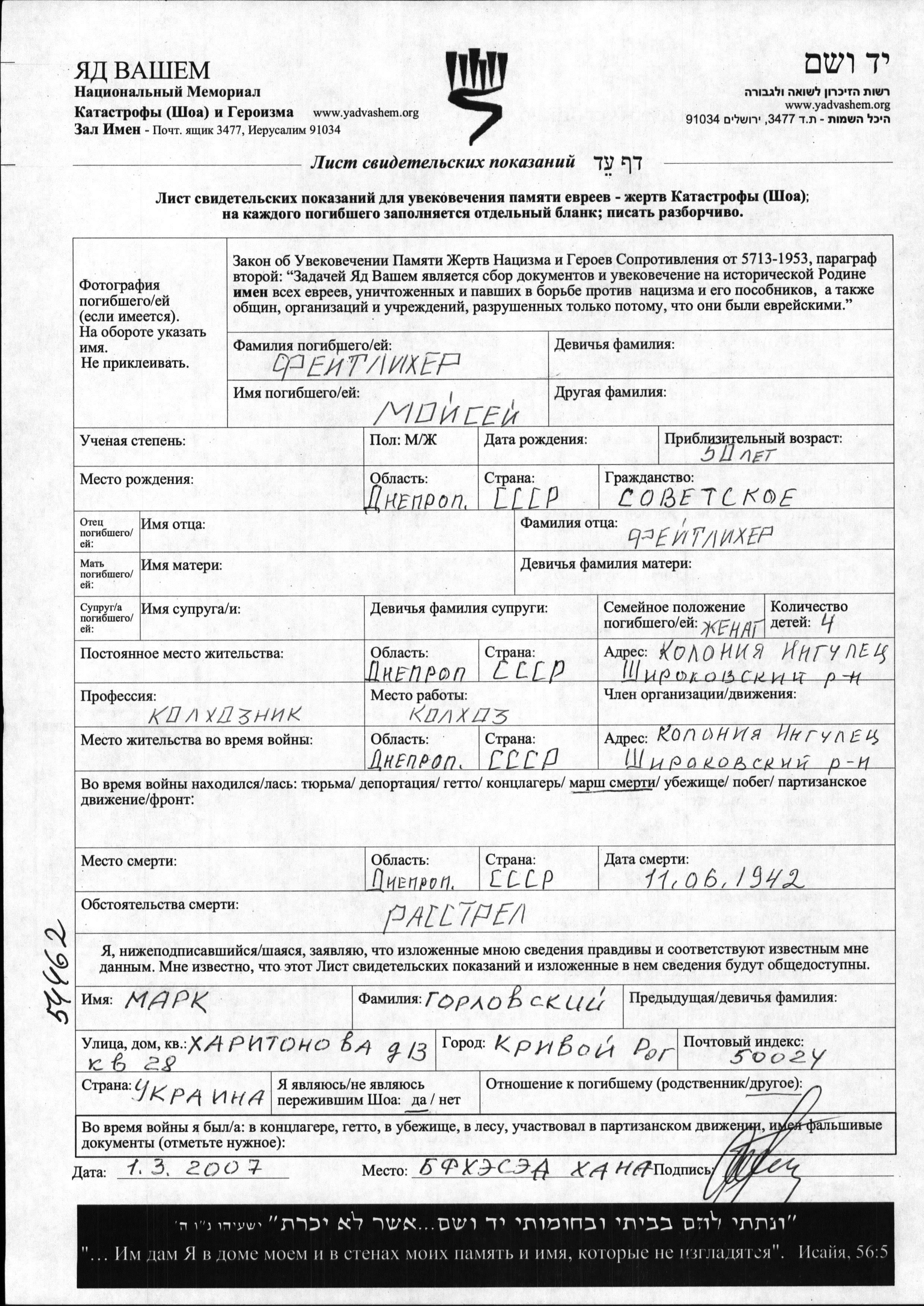 Feitlikher Moisey Ingulets, Ukraine (USSR) Page of Testimony