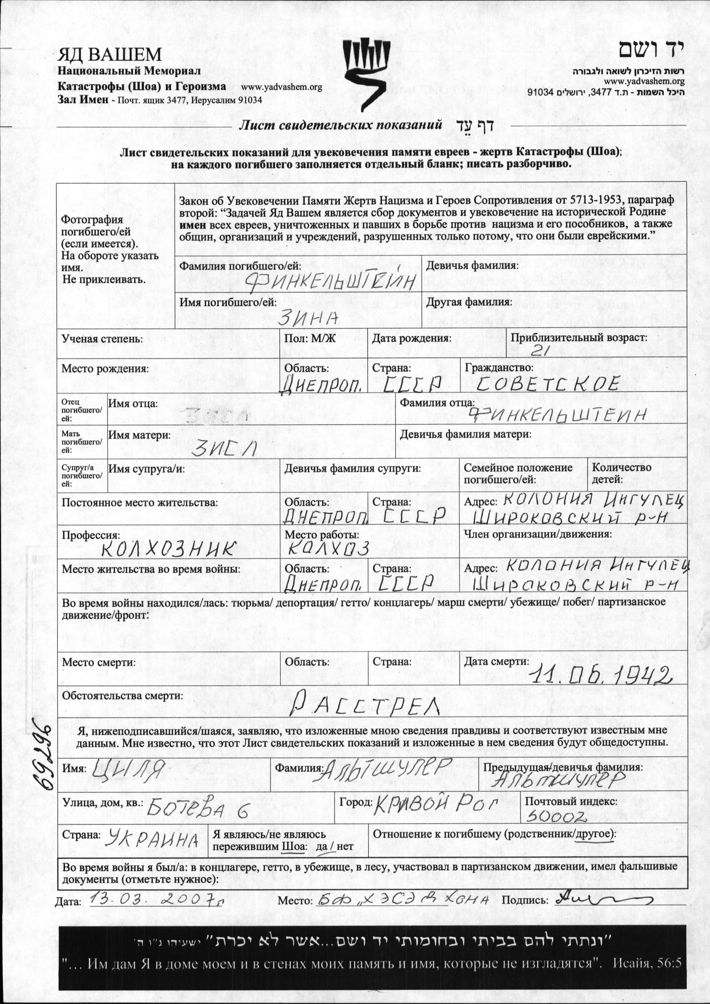 Zina Finkelshteyn was born in Dnepropetrovsk, Ukraine (USSR) to Zisl. She was a kolkhoznik / kolkhoznitza. Prior to WWII she lived in Ingulets, Ukraine (USSR). During the war she was in Ingulets, Ukraine (USSR). Zina was murdered in the Shoah. Place of death: unknown, 11/06/1942.