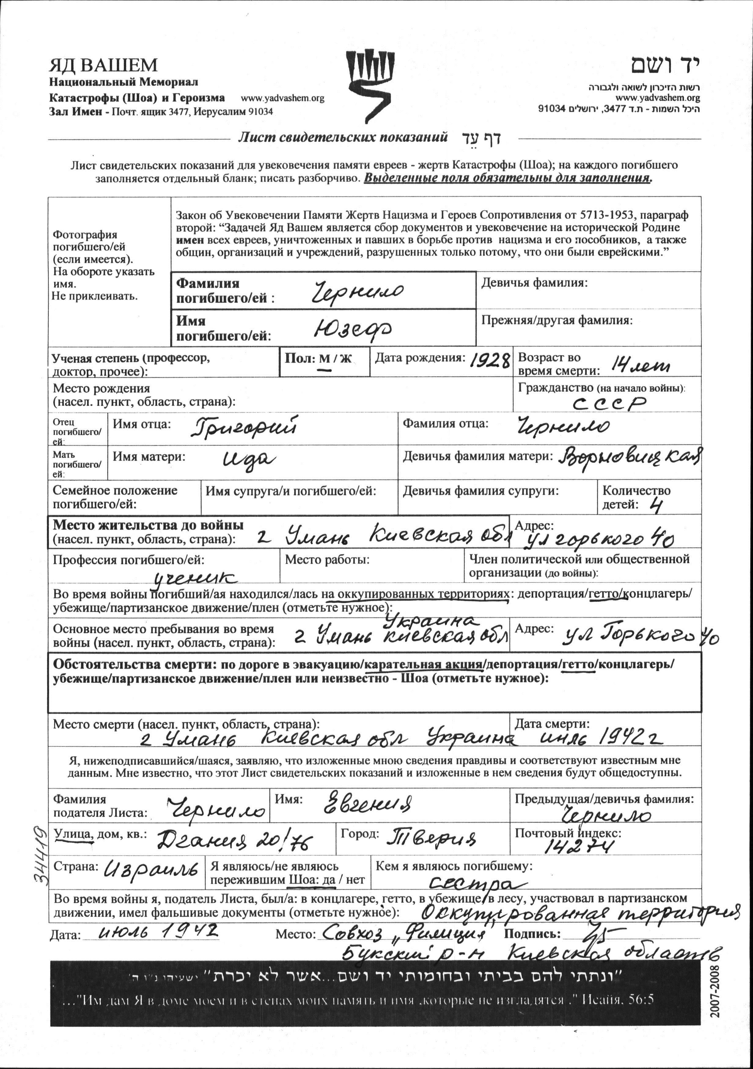 Yuzef Chernilo was born, 1928 to Grigori and Ida nee Vornovitzkaya. He was a pupil and teenager. Prior to WWII he lived in Umani, Ukraine (USSR). During the war he was in Uman, Ukraine (USSR). Yuzef was murdered in the Shoah. Place of death: Uman, Ukraine (USSR), 07/1942.