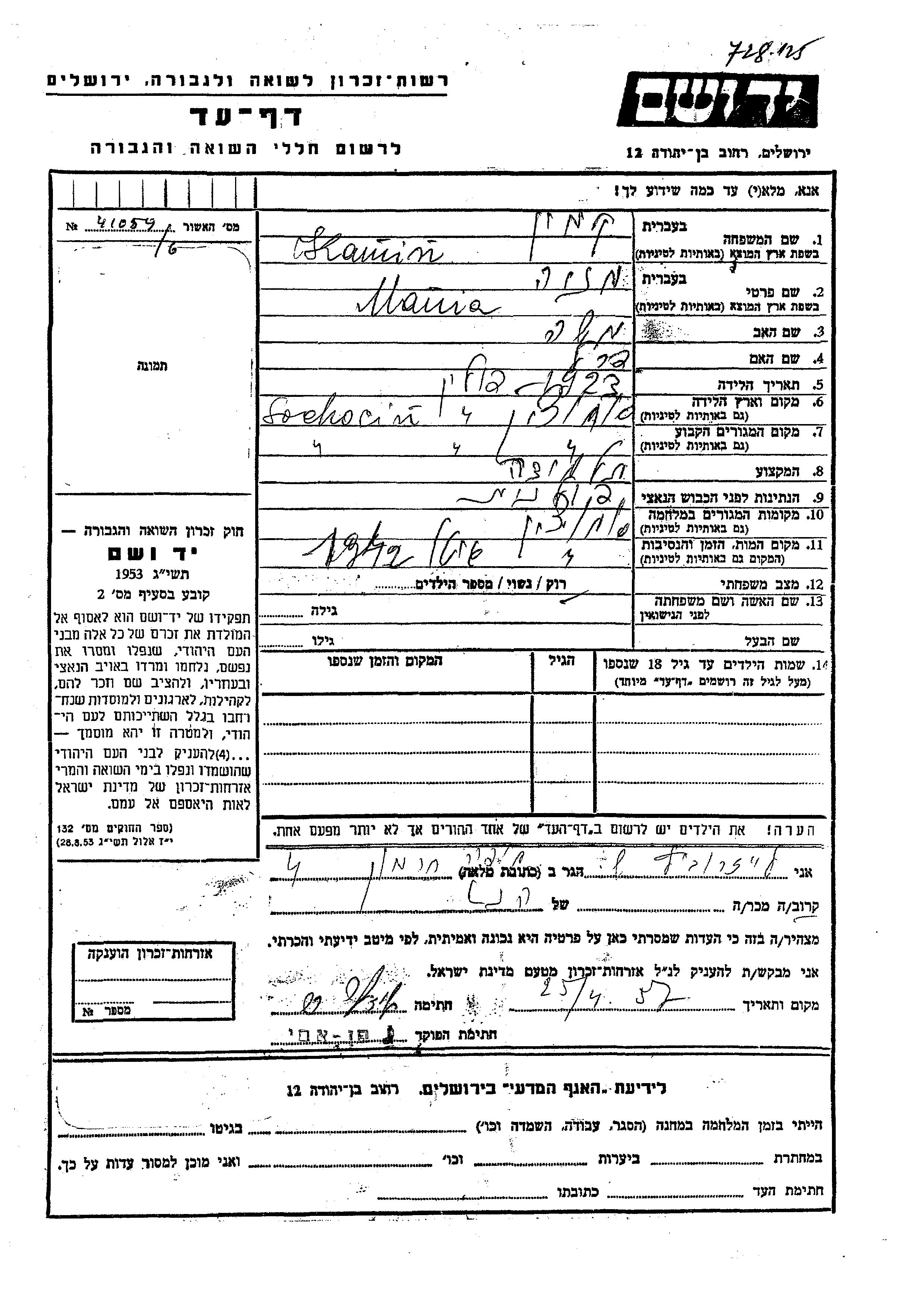 Mania Kamien was born in Sochocin, Poland, 1923 to Moshe and Perel. She was a pupil and single. Prior to WWII she lived in Sochocin, Poland. During the war she was in Sochocin, Poland. Mania was murdered in the Shoah. Place of death: Sochocin, Poland, 1942.