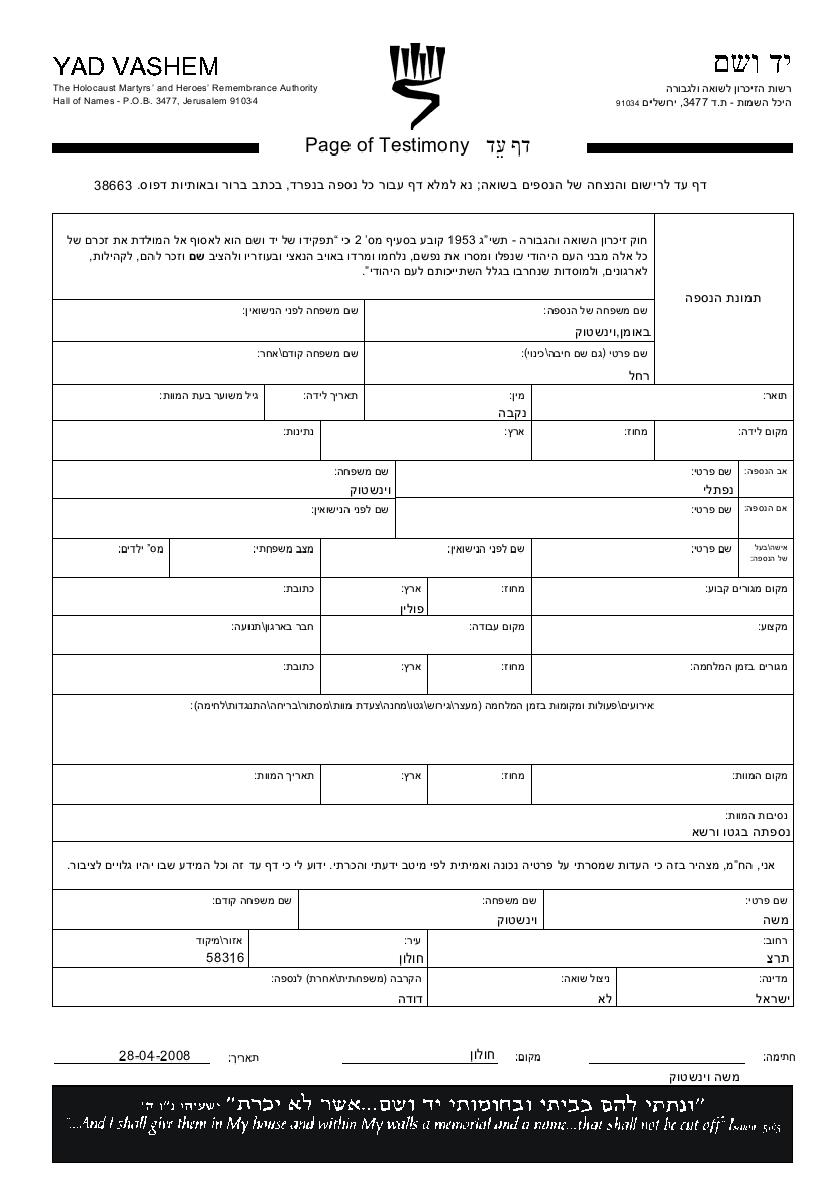 Rakhel Bauman nee Vinshtok was born to Naftali. She was married. Prior to WWII she lived in Poland. During the war she was in Warszawa, Poland. Rakhel was murdered in the Shoah. Place of death: Warszawa, Poland.