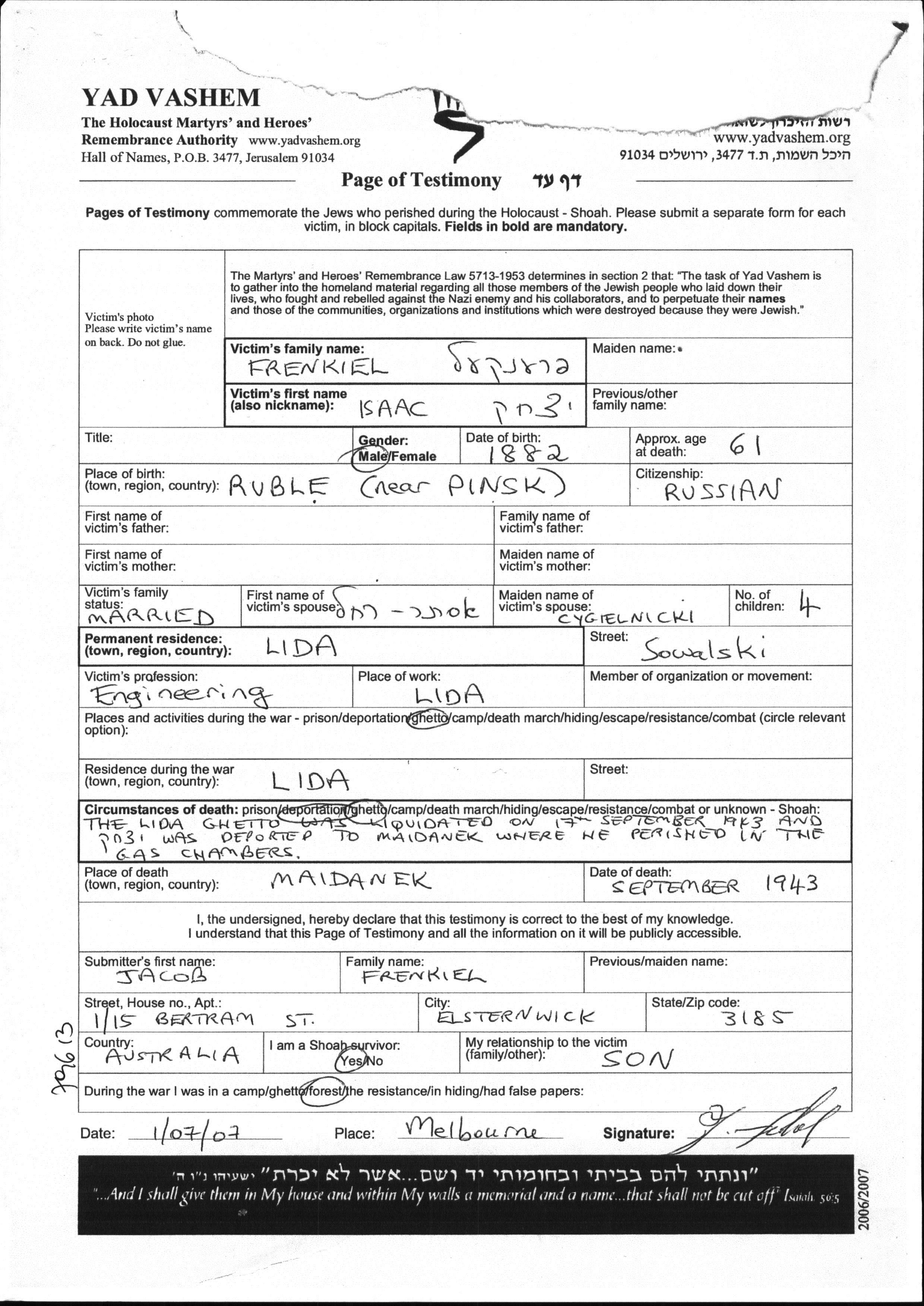 Frenkiel Isaac 1882 Lida, Poland Page of Testimony