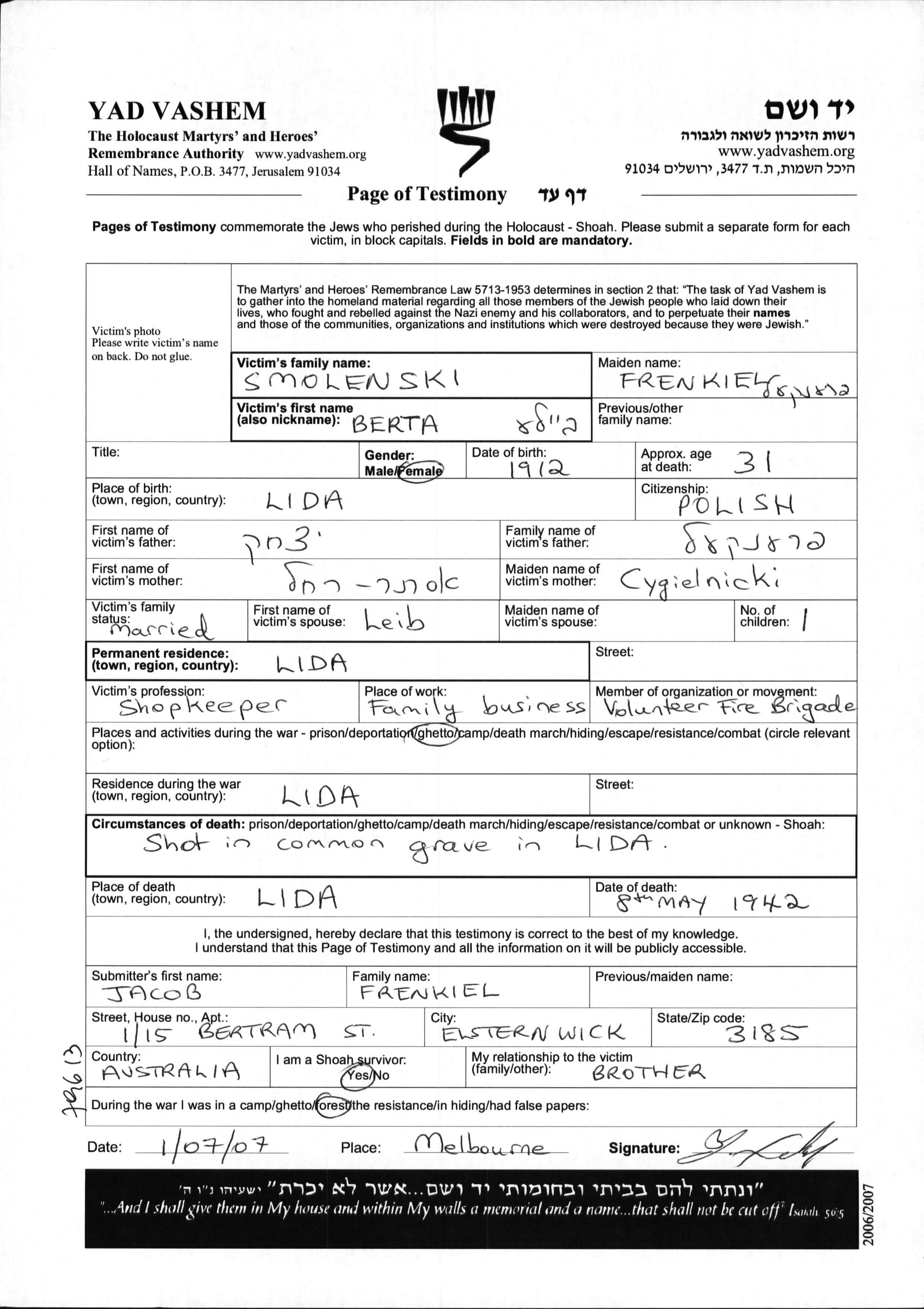 Smolenski Berta Beile 1912 Lida, Poland Page of Testimony