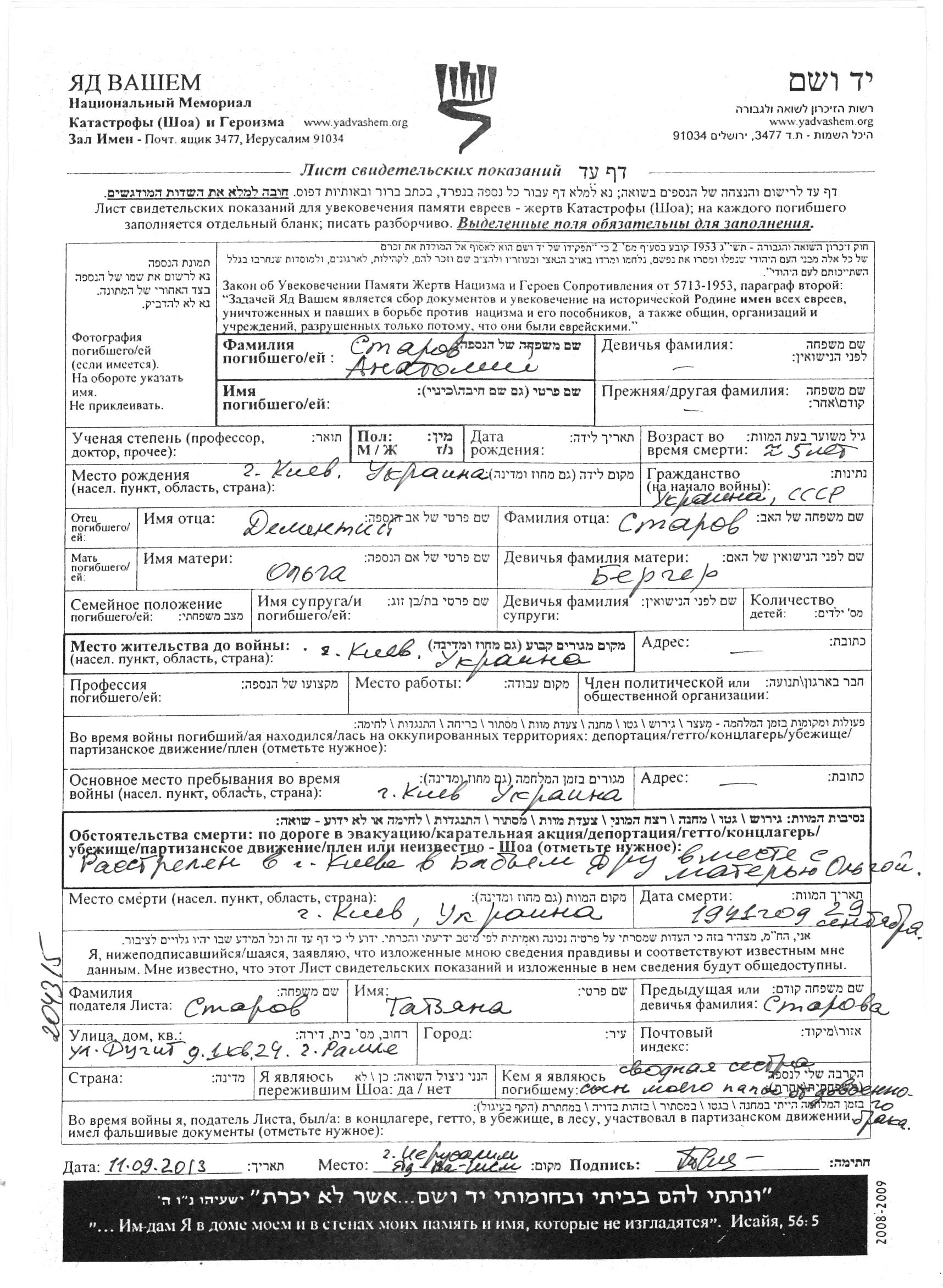 Starov Anatolyi Kiev, Ukraine (USSR) Page of Testimony