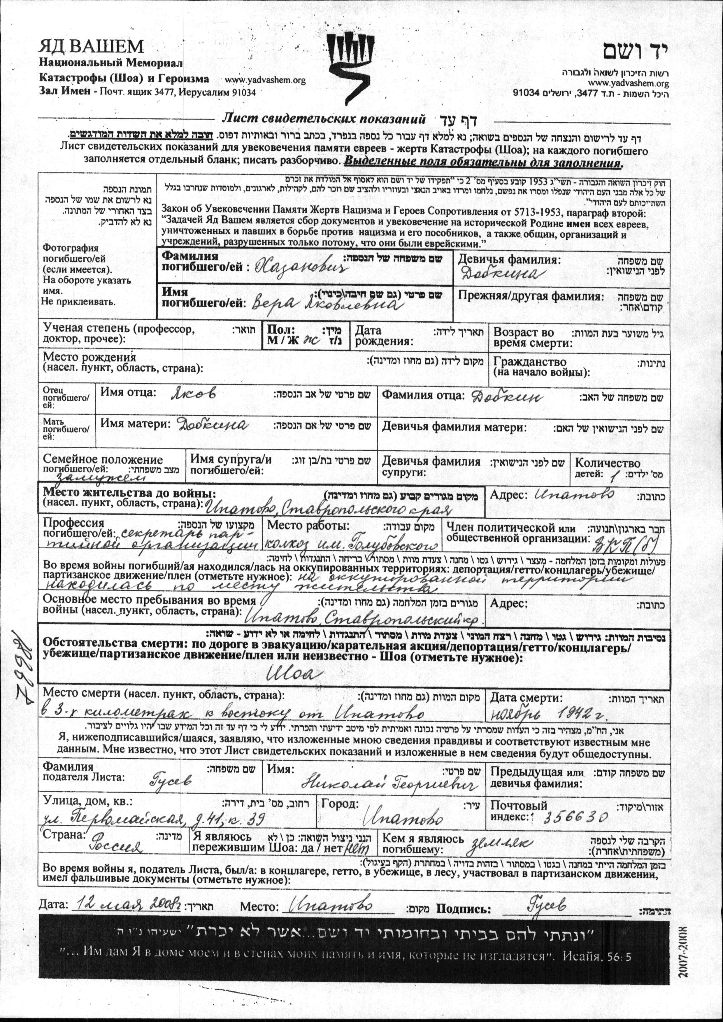 Vera Khazanovich nee Dobkina was born to Yakov. She was a sekretar partorganizatzii and married. Prior to WWII she lived in Ipatovo, Russia (USSR). During the war she was in Ipatovo, Russia (USSR). Vera was murdered in the Shoah. Place of death: Ipatovo, Russia (USSR), 11/1942.