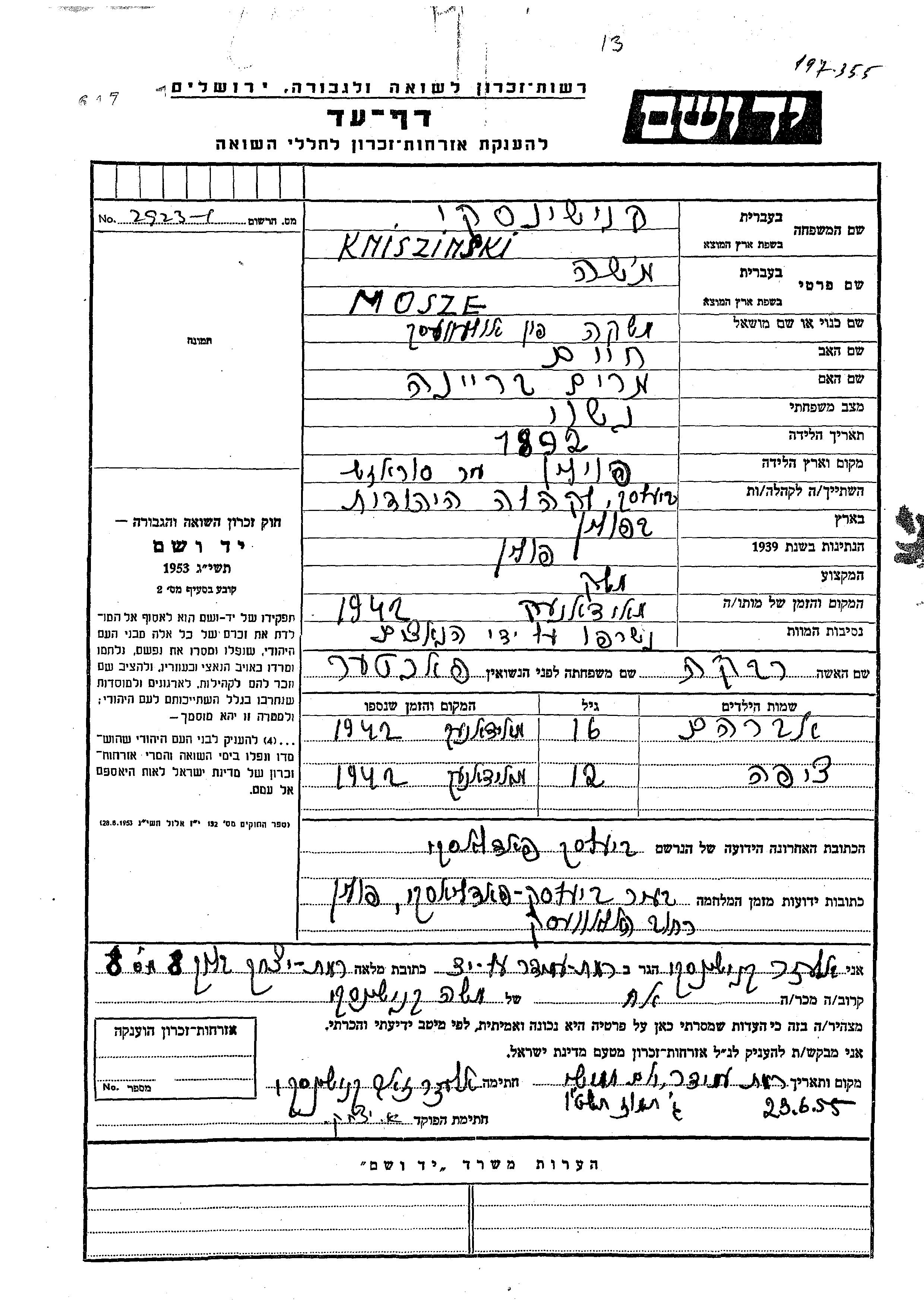 Mosze Mashka Kniszinski was born in Suraz, Poland, 1892 to Khaim and Miriam Breina. He was married to Rivka nee Pakhter. Prior to WWII he lived in Bilsk, Poland. During the war he was in Bilsk, Poland. Mosze Mashka was murdered in the Shoah. Place of death: Majdanek, Poland, 1942.