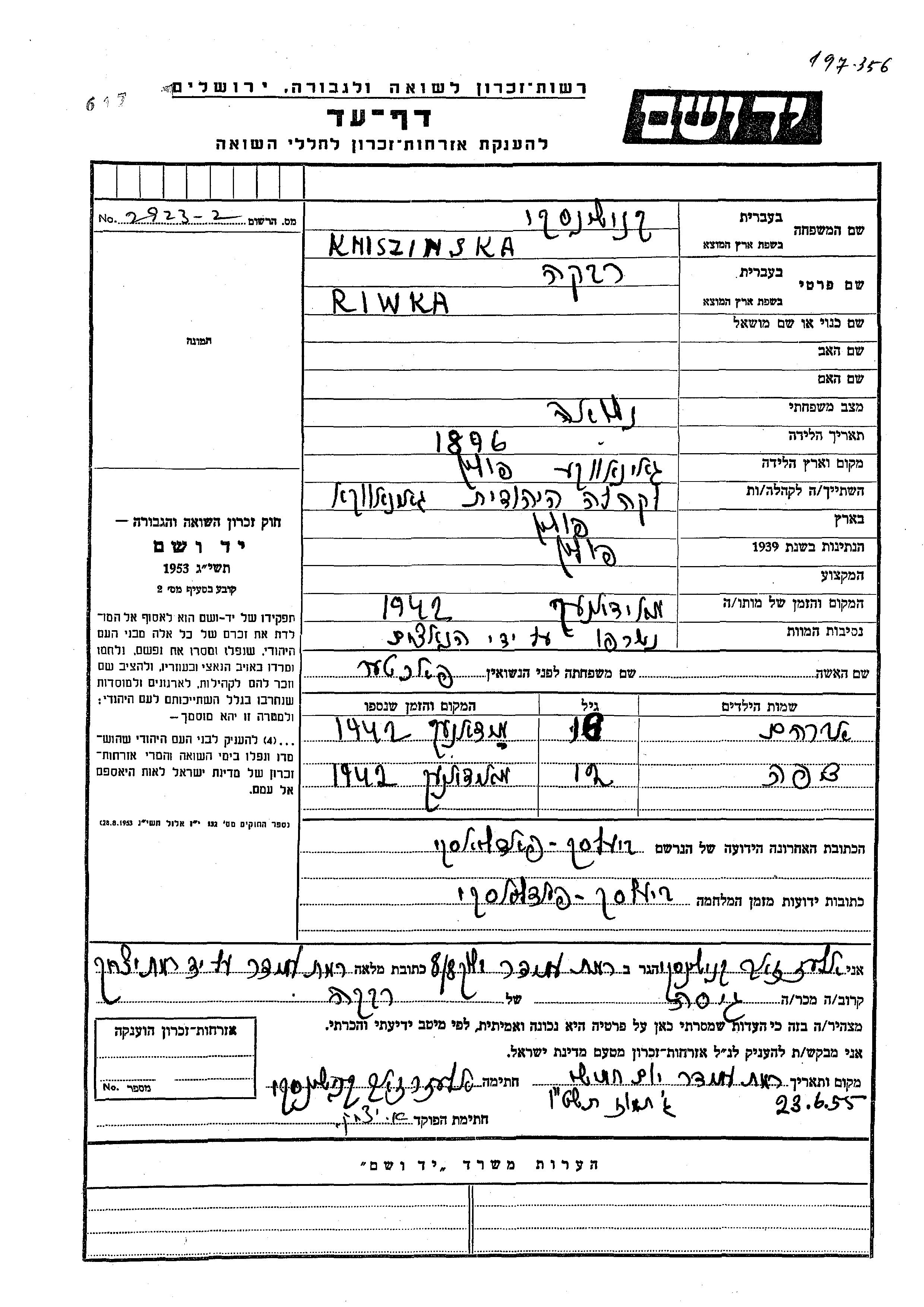 Riwka Kniszinska nee Pakhter was born in Hajnówka, Poland, 1896. She was married. Prior to WWII she lived in Hajnówka, Poland. During the war she was in Bielsk Podlaski, Poland. Riwka was murdered in the Shoah. Place of death: Majdanek, Poland, 1942.