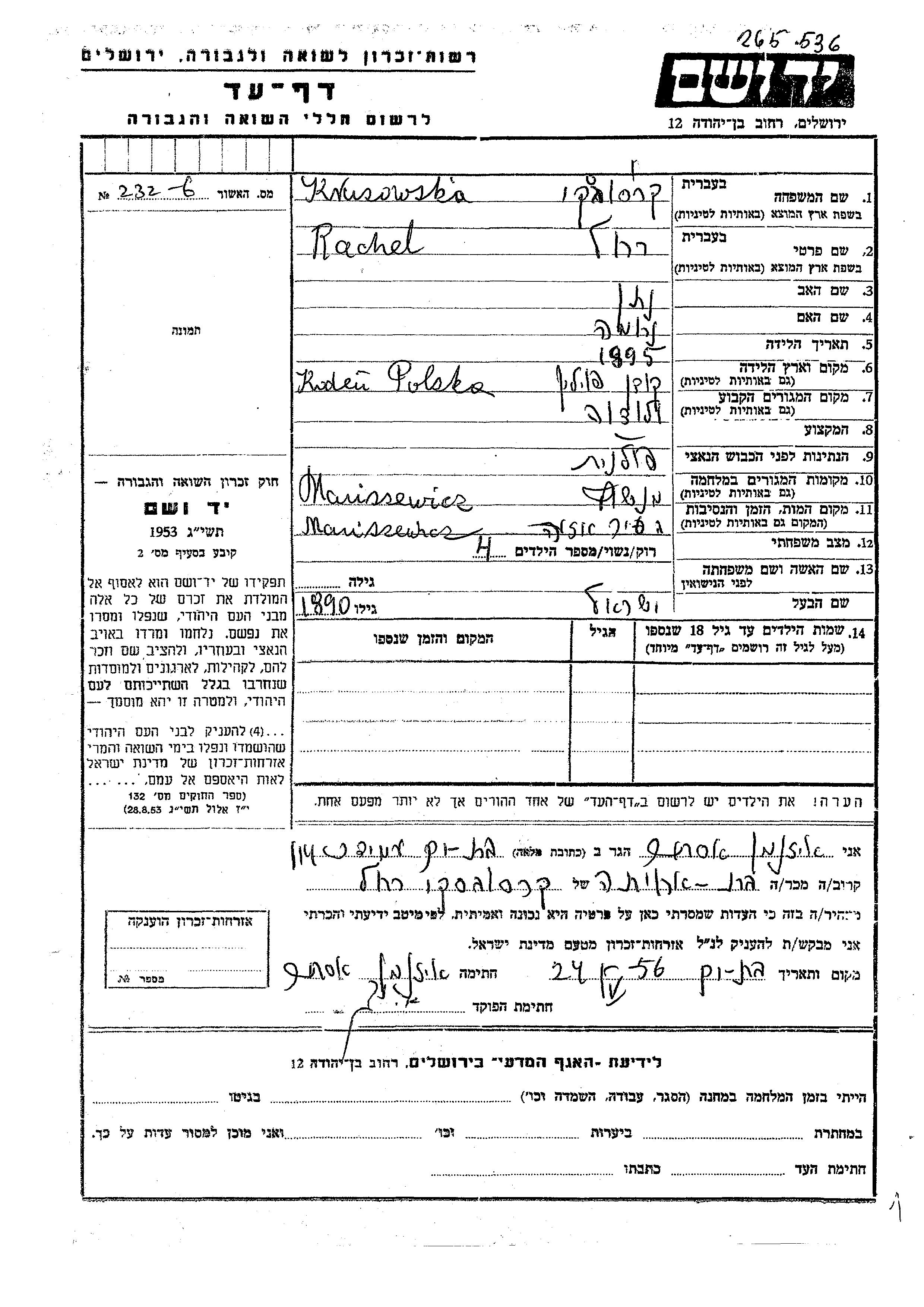Krusowska Rachel 1895 Wlodawa, Poland Page of Testimony