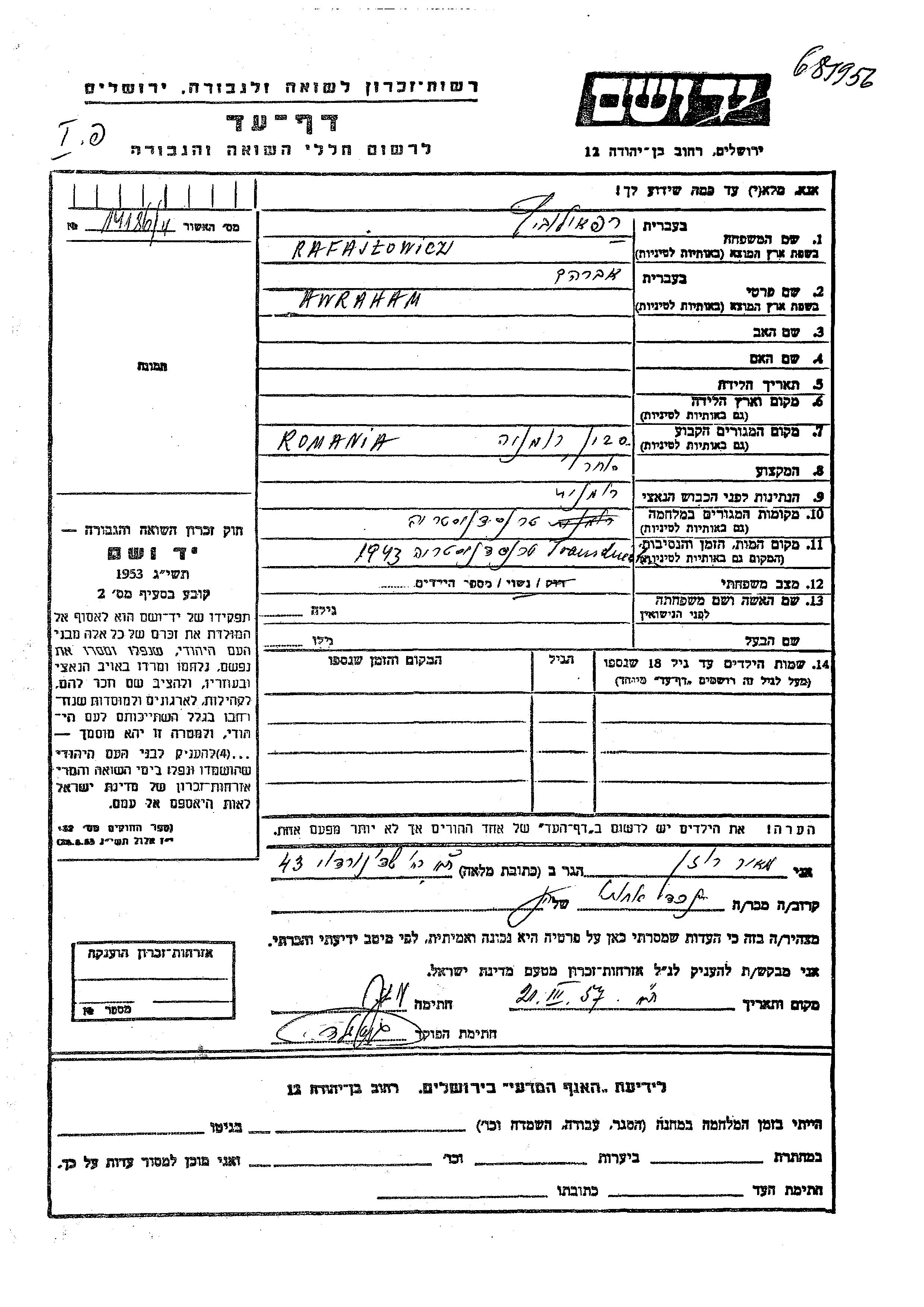 Rafajlowicz Awraham Romania Page of Testimony