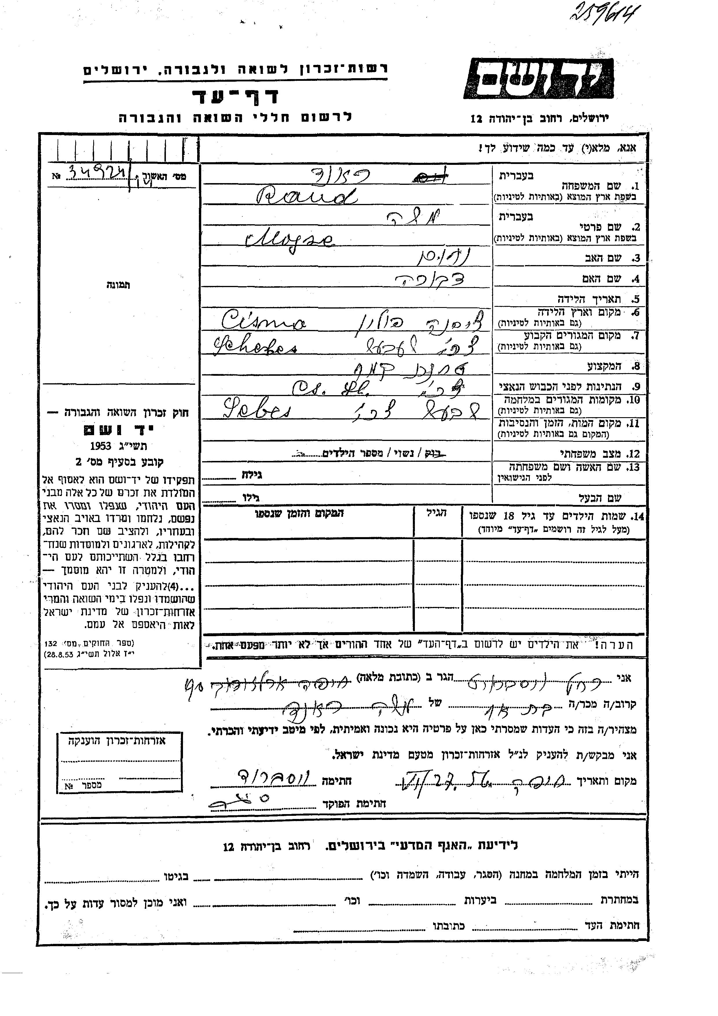 Mojse Rand Razond was born in Cisna, Poland to Nakhum and Dvora. He was married. Prior to WWII he lived in Sebes, Czechoslovakia. During the war he was in Sebes, Czechoslovakia. Mojse was murdered in the Shoah.