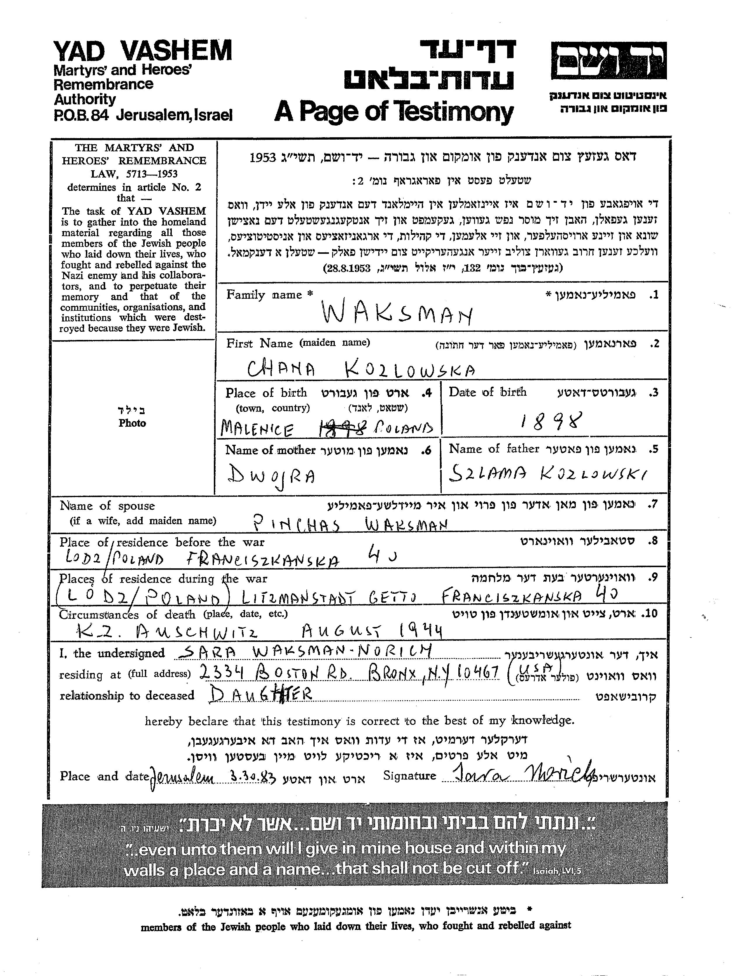 Chana Waksman nee Kozlowska was born in Maleniec, Poland, 1898 to Szlama and Dwojra. She was married to Pinchas. Prior to WWII she lived in Lodz, Poland. During the war she was in Litzmannstadt, Poland. Chana was murdered in the Shoah. Place of death: Auschwitz, Poland, 08/1944.
