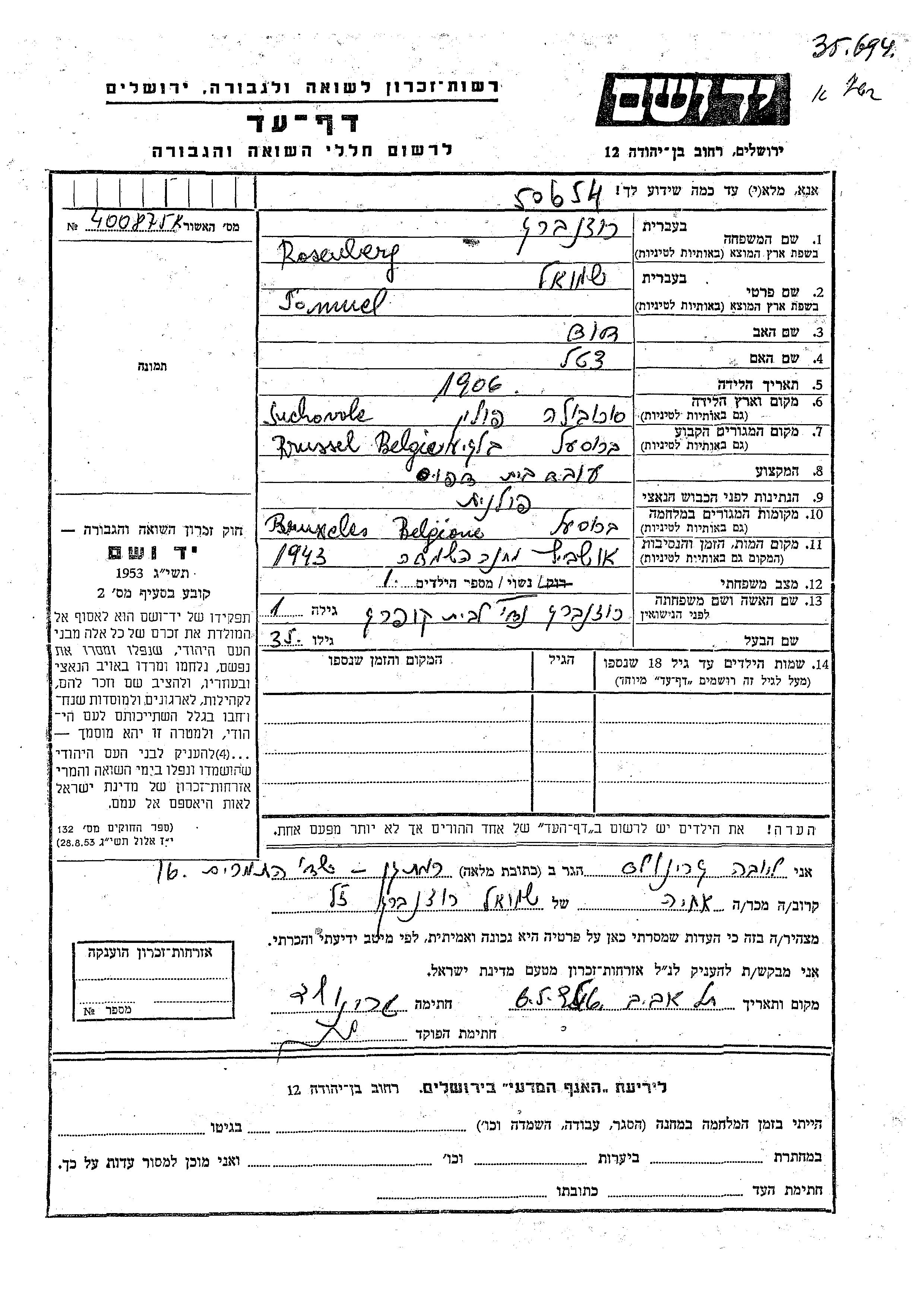 Shmuel Rosenberg was born in Suchowola, Poland, 1906 to David and Tzetel. He was a printing house worker and married to Nadi nee Koprak. Prior to WWII he lived in Brussels, Belgium. During the war he was in Brussels, Belgium. Shmuel was murdered in the Shoah. Place of death: Auschwitz, Poland, 1943.