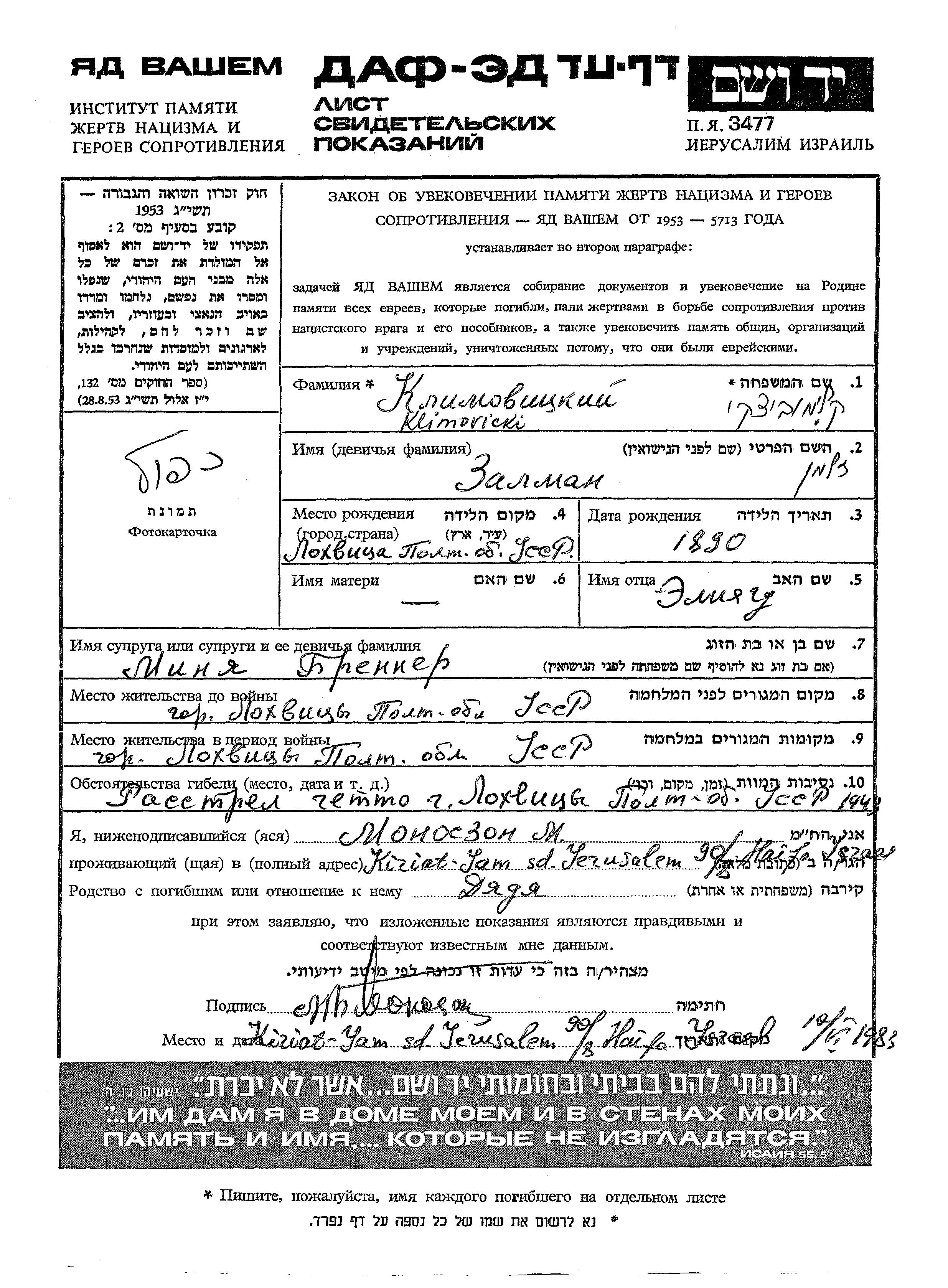 Klimovicki Zalman 1890 Lokhvitsa, Ukraine (USSR) Page of Testimony