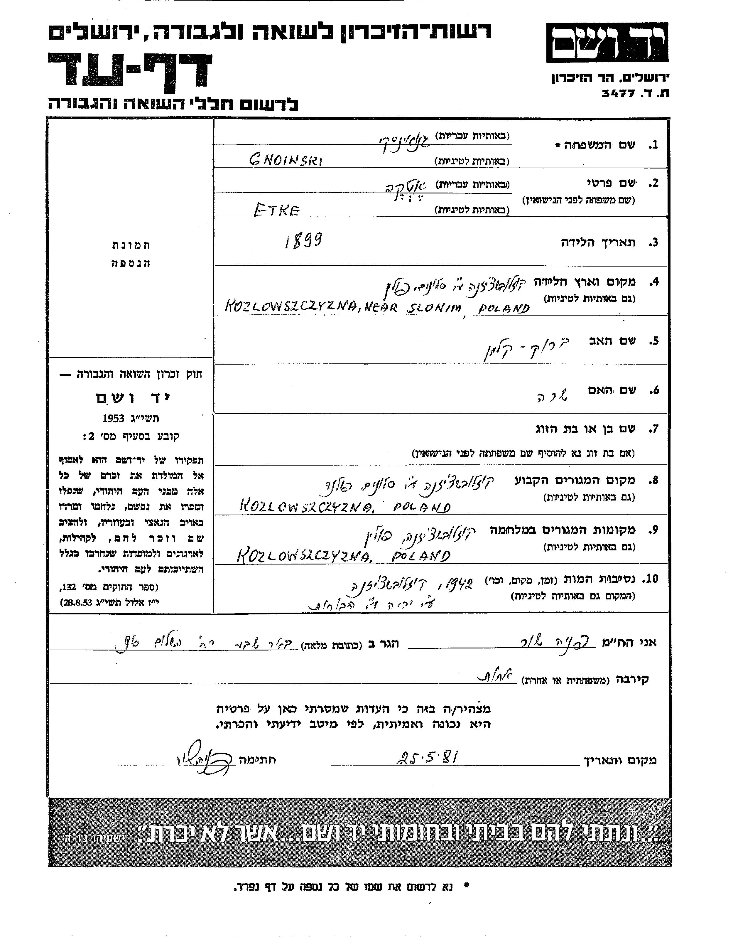 Etke Gnoinski was born in Kozlowszczyzna, Poland, 1899 to Barukh Kalman and Sara. Prior to WWII she lived in Kozlowszczyzna, Poland. During the war she was in Kozlowszczyzna, Poland. Etke was murdered in the Shoah. Place of death: Kozlowszczyzna, Poland, 1942.